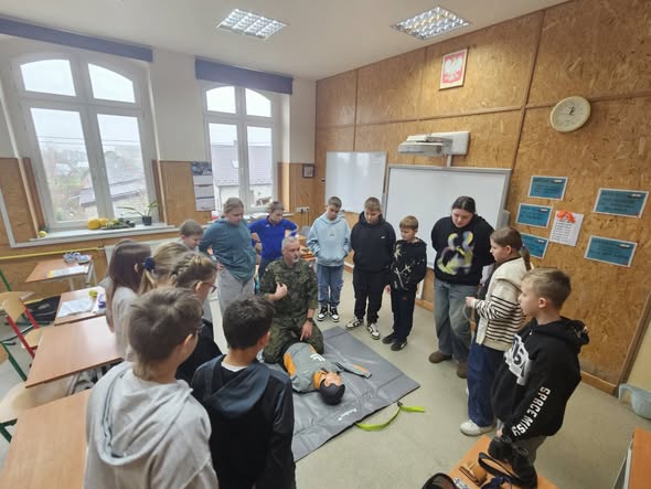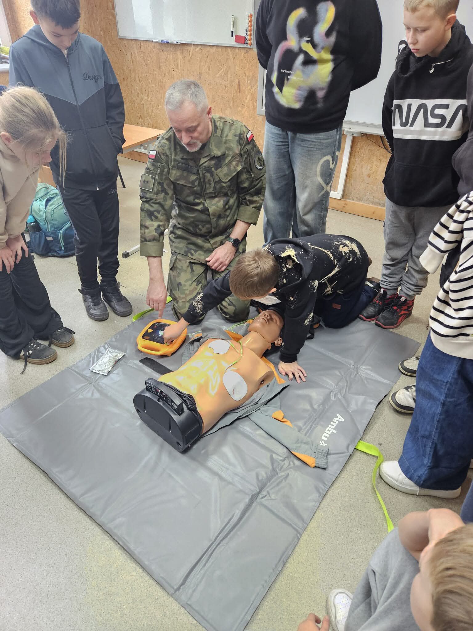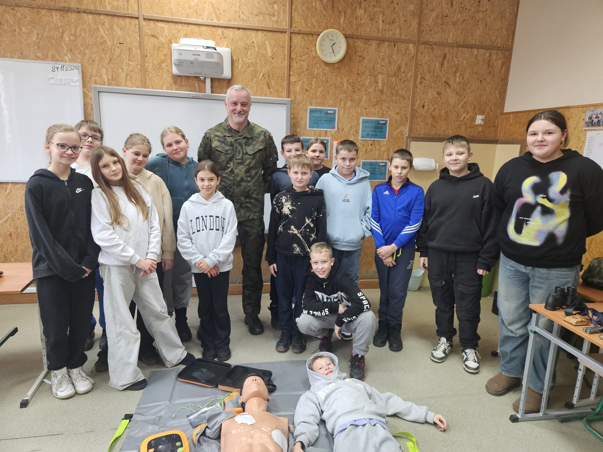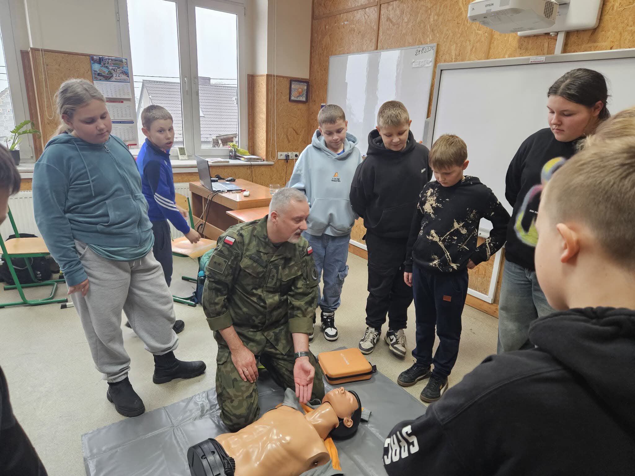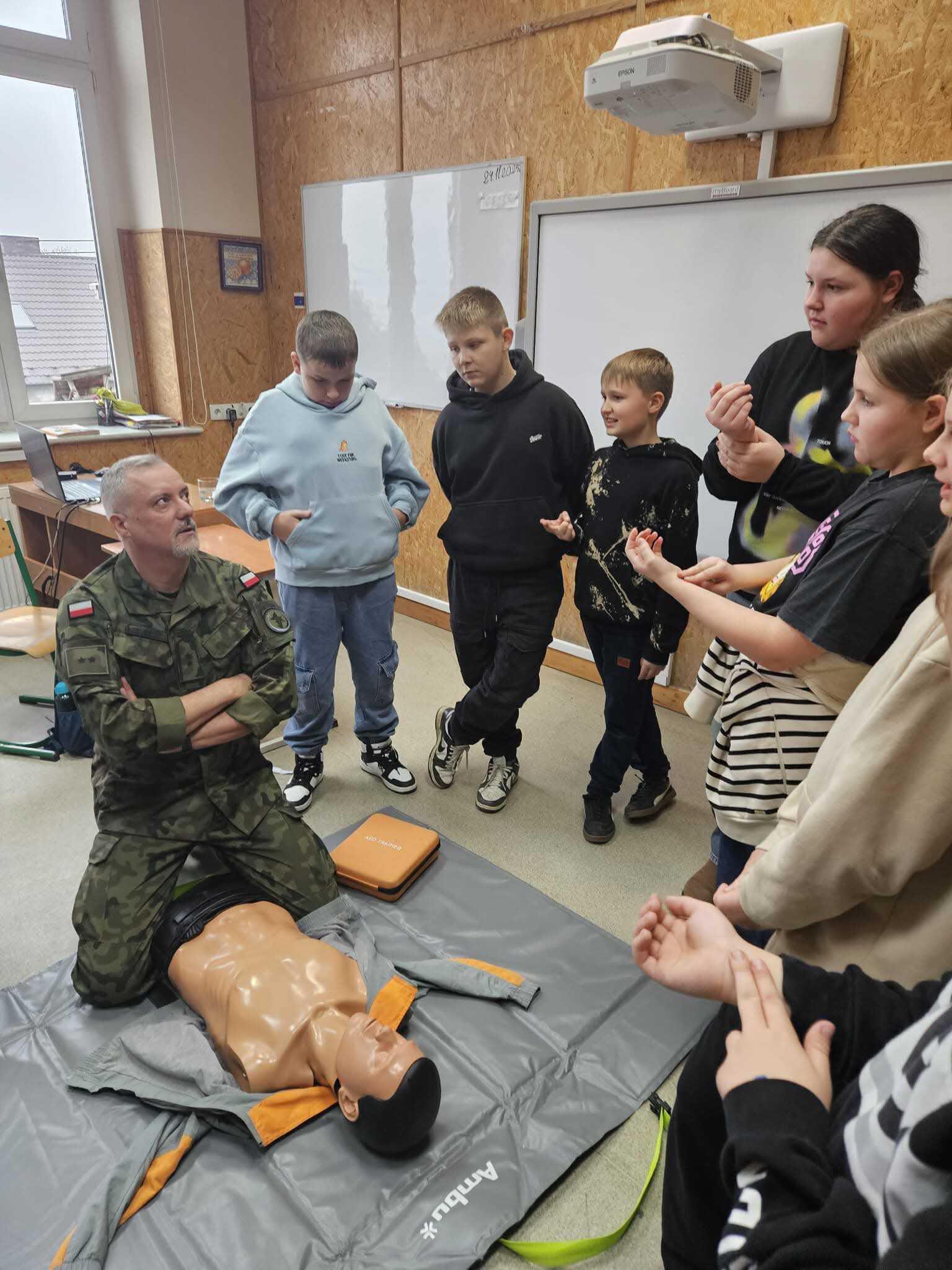 Klasa 5 miała dzisiaj przyjemność uczestniczyć w spotkaniu z żołnierzem 31. Bazy Lotnictwa Taktycznego Poznań- Krzesiny w ramach programu „Edukacja z wojskiem”. Uczniowie zapoznali się m.in. z zasadami alarmowania, sposobami szukania i wzywania pomocy, podstawami ewakuacji i schronienia, technikami udzielania pomocy czy reagowania w sytuacjach trudnych. Zajęcia spotkały się z zainteresowaniem uczniów, którzy chętnie zadawali pytania i poszerzali swoją wiedzą z zakresu wojskowości i szeroko rozumianego pojęcia bezpieczeństwa.