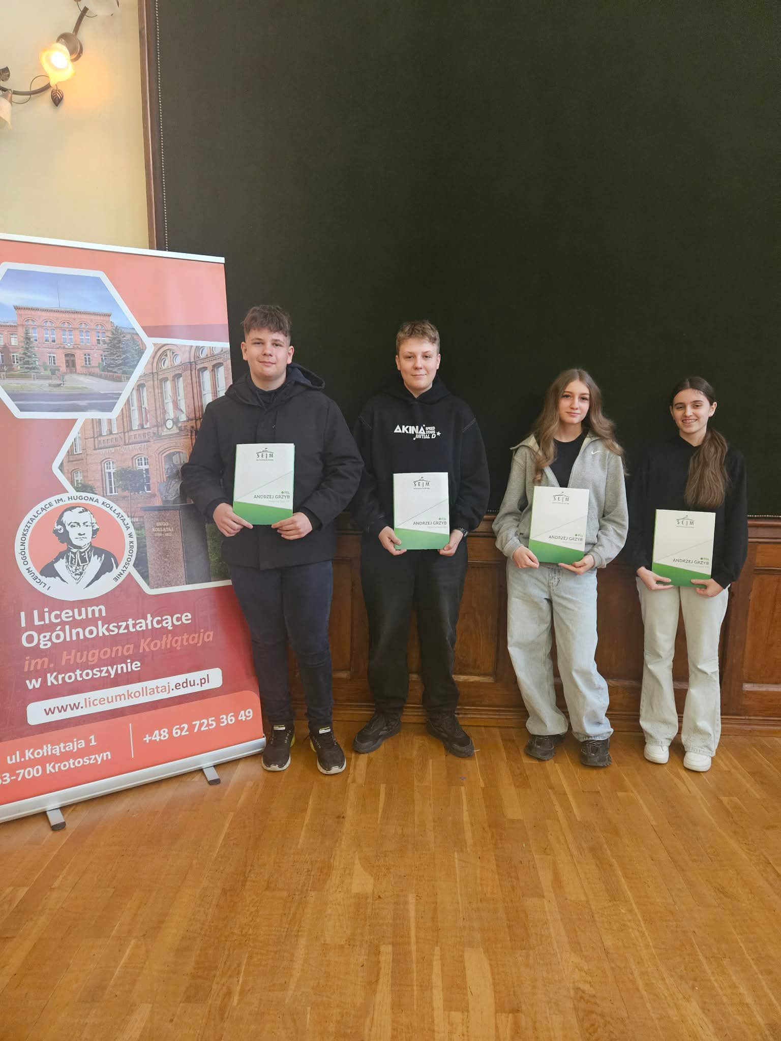 Z dumą ogłaszamy, że dzisiaj odbyło się uroczyste ogłoszenie wyników konkursu historycznego, który miał miejsce 25 marca w ILO w Krotoszynie. Zajęliśmy II miejsce wśród szkół powiatu krotoszyńskiego. Naszą szkołę reprezentowała drużyna w składzie: Celina Baranowska, Hugo Krysiak, Szymon Kołogrecki, Zuzanna Zygmunt. Uczestnicy wygrali wyjazd do Warszawy połączony ze zwiedzaniem Sejmu RP.