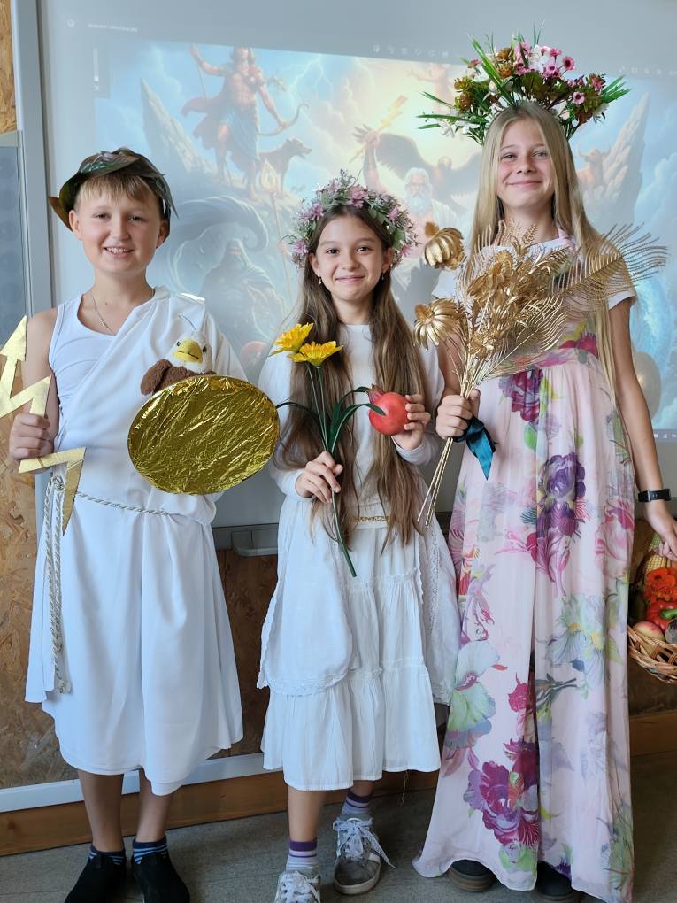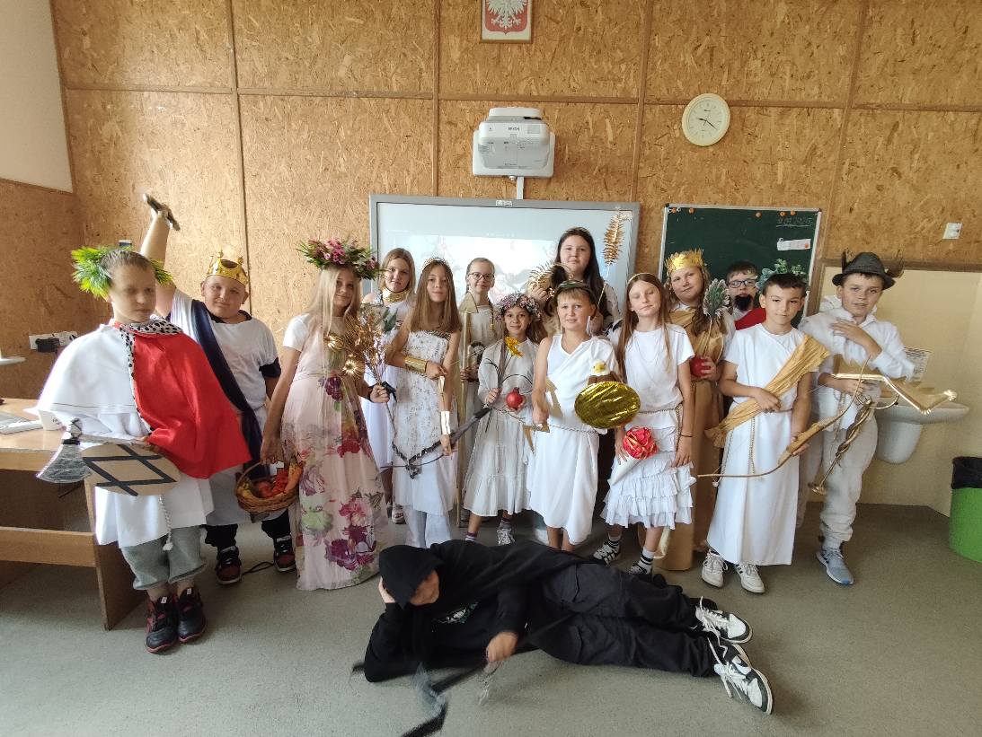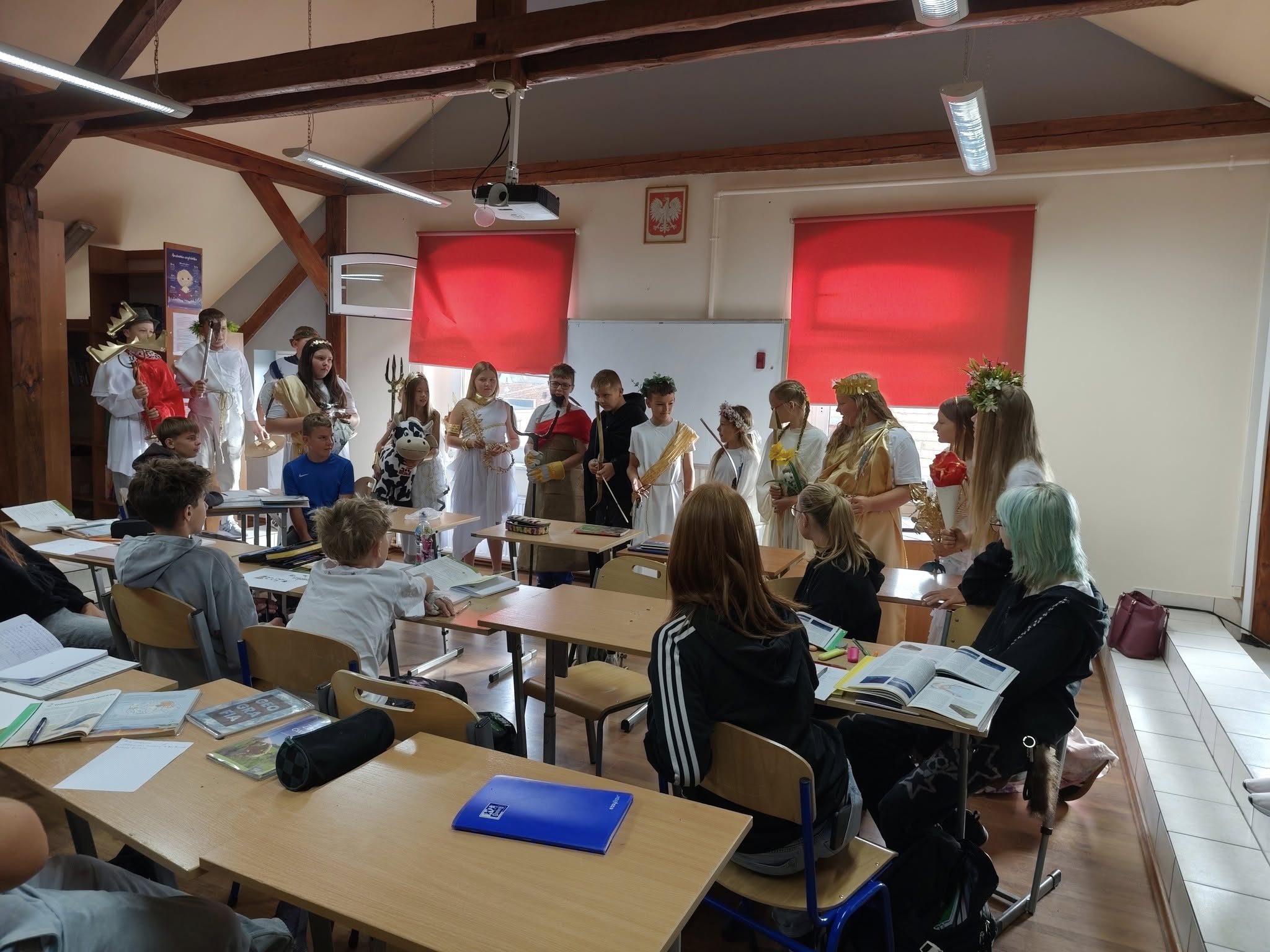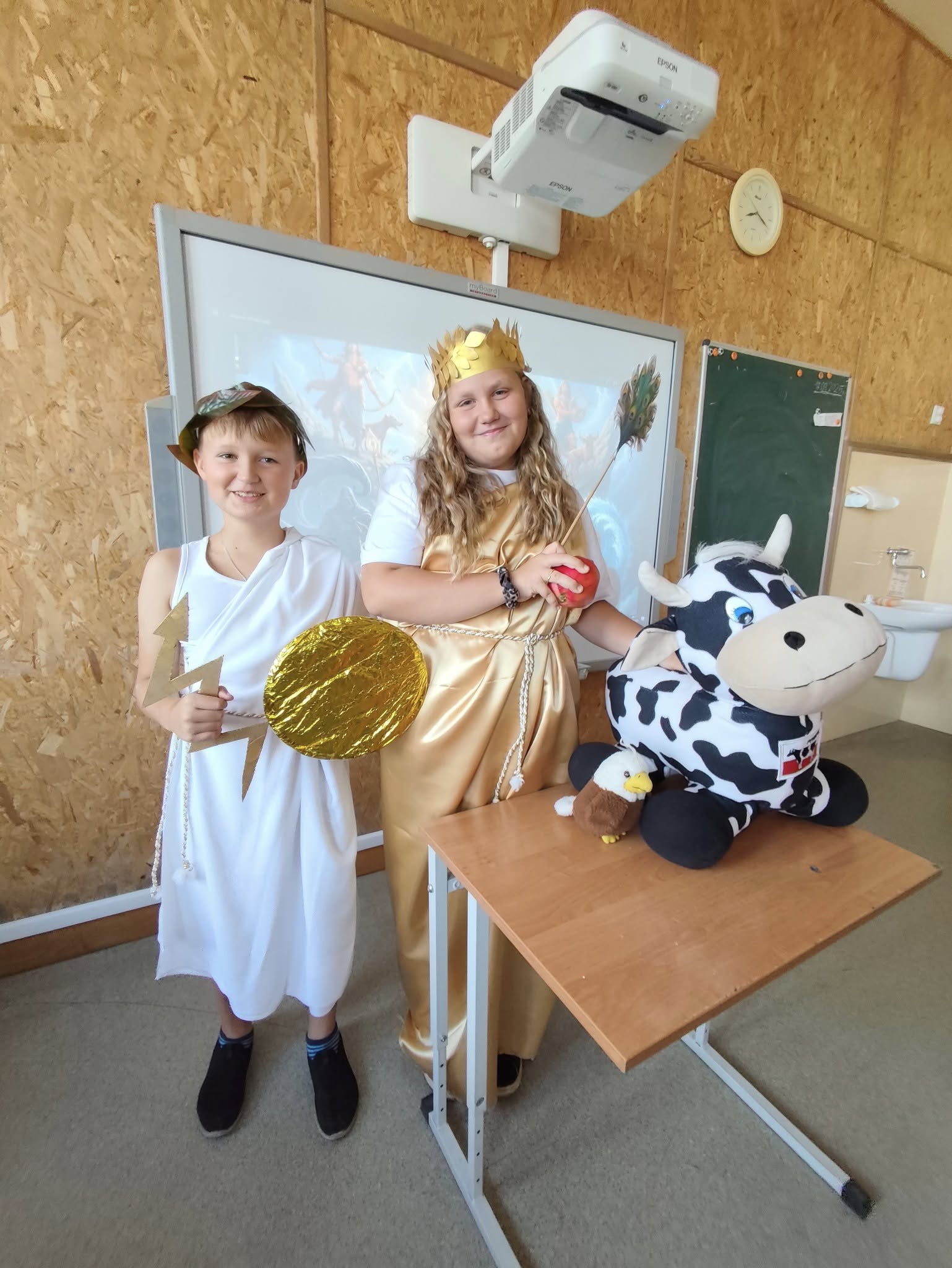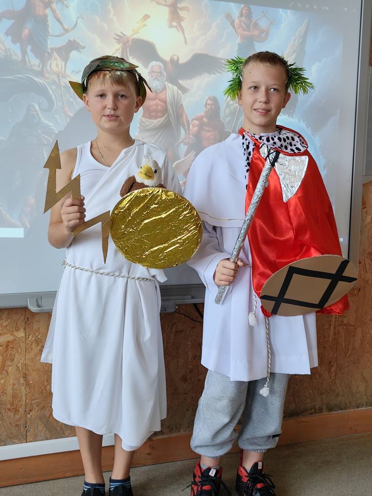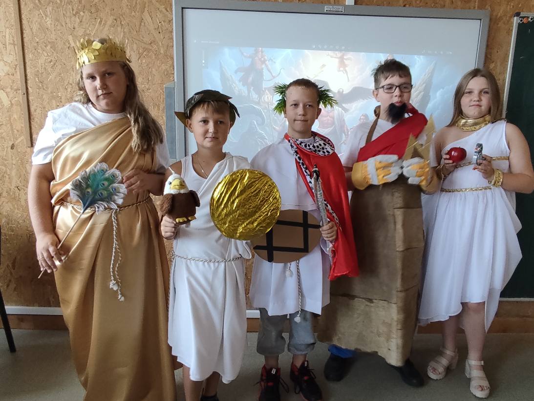 Jak co roku we wrześniu klasa 5 rozpoczyna swoją przygodę z mitologią grecką wielką prezentacją bogow olimpijskich. Ta niezwykła lekcja, pełna emocji związanych z odkrywaniem relacji między mitologicznymi postaciami, pozwala zapamiętać na lata przygody i atrybuty bogów. Świat greckiej mitologii to jeden z ważnych fundamentów kultury śródziemnomorskiej, której jesteśmy spadkobiercami. Klasa 5 rewelacyjnie przygotowała się do prezentacji, zbierając informacje o swoich bohaterach i wcielając się w nich przebraniem i przyniesionymi atrybutami. Wielka olimpijska rodzina przedstawiła się także uczniom klas 1 – 3 oraz zafundowała powtórkę z mitologii klasie 8. Okazało się, że najstarsi uczniowie sporo pamiętają z lekcji, którą trzy lata temu sami przerabiali. Znakomicie poradzili sobie z uporządkowaniem pozamienianych między bogami atrybutów. Jak widać najlepszą formą nauki jest dobra zabawa!