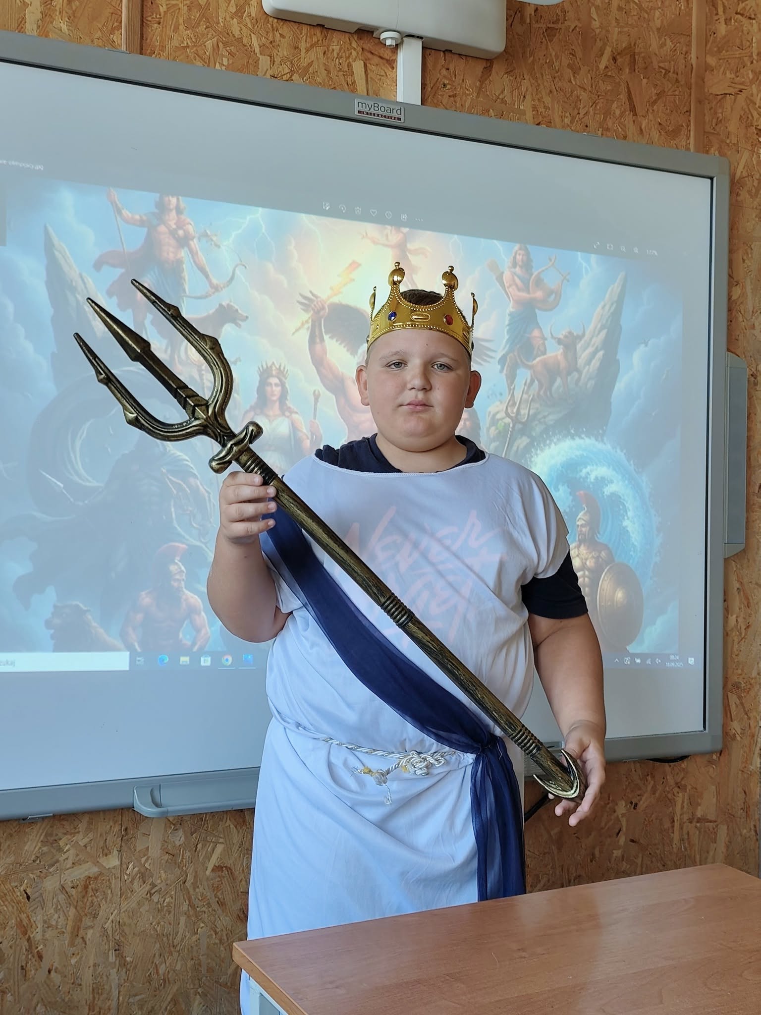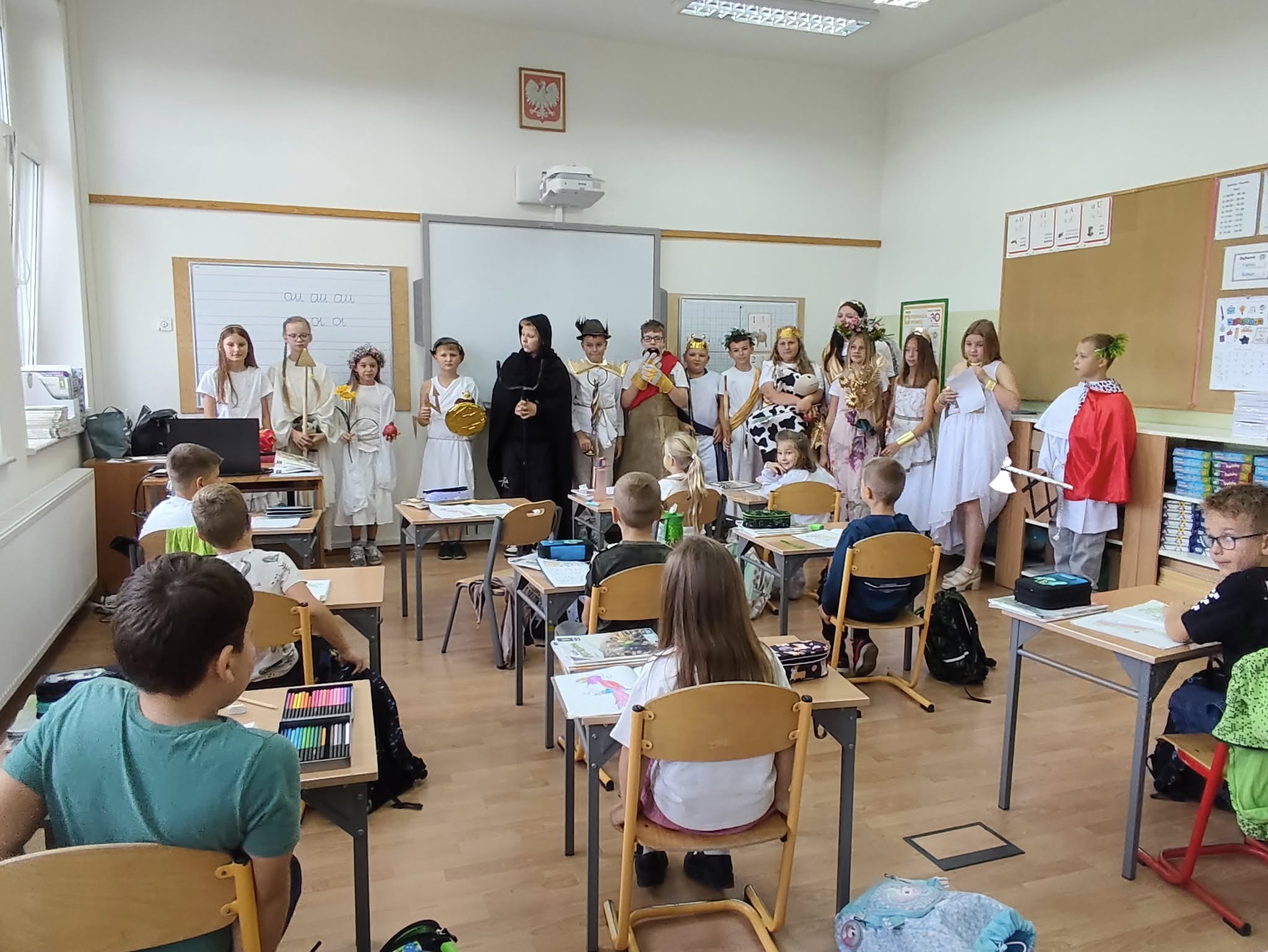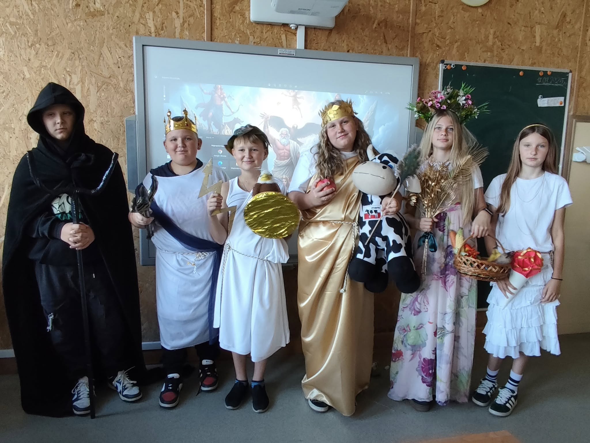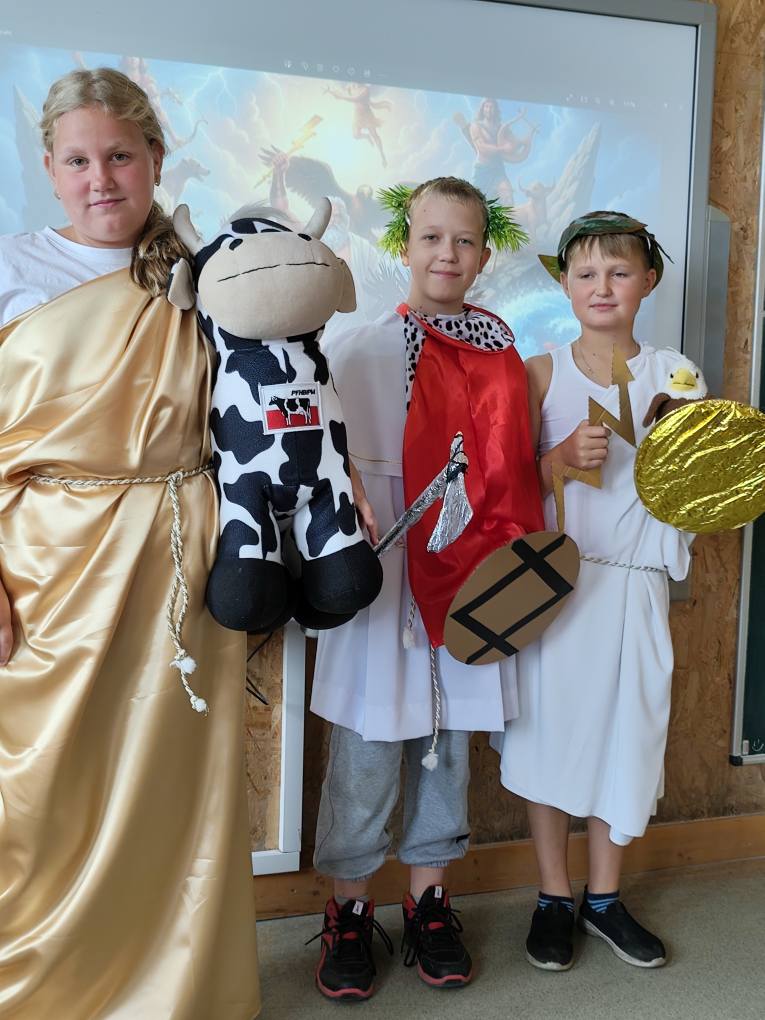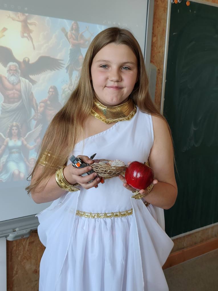 Jak co roku we wrześniu klasa 5 rozpoczyna swoją przygodę z mitologią grecką wielką prezentacją bogow olimpijskich. Ta niezwykła lekcja, pełna emocji związanych z odkrywaniem relacji między mitologicznymi postaciami, pozwala zapamiętać na lata przygody i atrybuty bogów. Świat greckiej mitologii to jeden z ważnych fundamentów kultury śródziemnomorskiej, której jesteśmy spadkobiercami. Klasa 5 rewelacyjnie przygotowała się do prezentacji, zbierając informacje o swoich bohaterach i wcielając się w nich przebraniem i przyniesionymi atrybutami. Wielka olimpijska rodzina przedstawiła się także uczniom klas 1 – 3 oraz zafundowała powtórkę z mitologii klasie 8. Okazało się, że najstarsi uczniowie sporo pamiętają z lekcji, którą trzy lata temu sami przerabiali. Znakomicie poradzili sobie z uporządkowaniem pozamienianych między bogami atrybutów. Jak widać najlepszą formą nauki jest dobra zabawa!