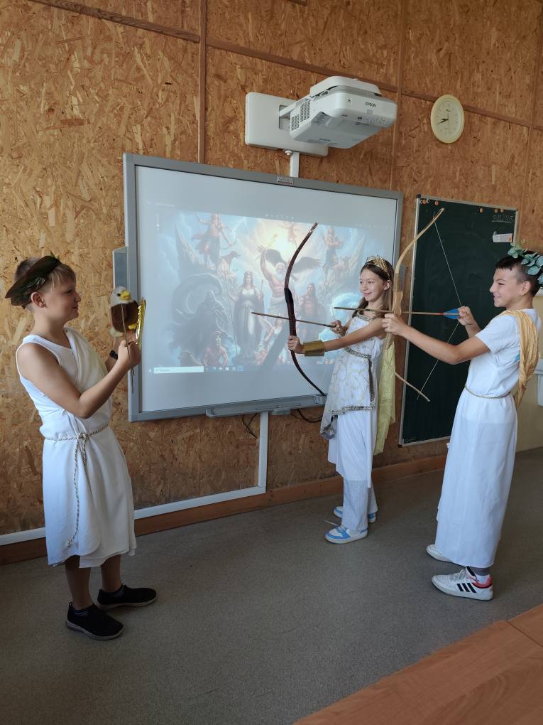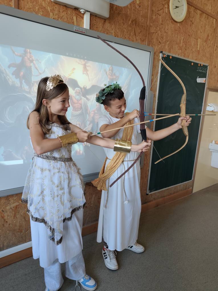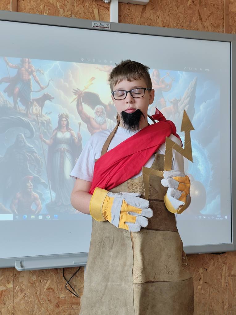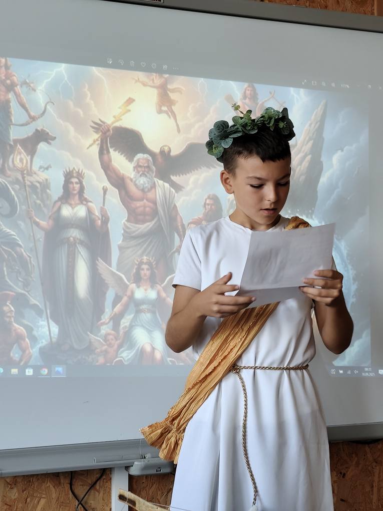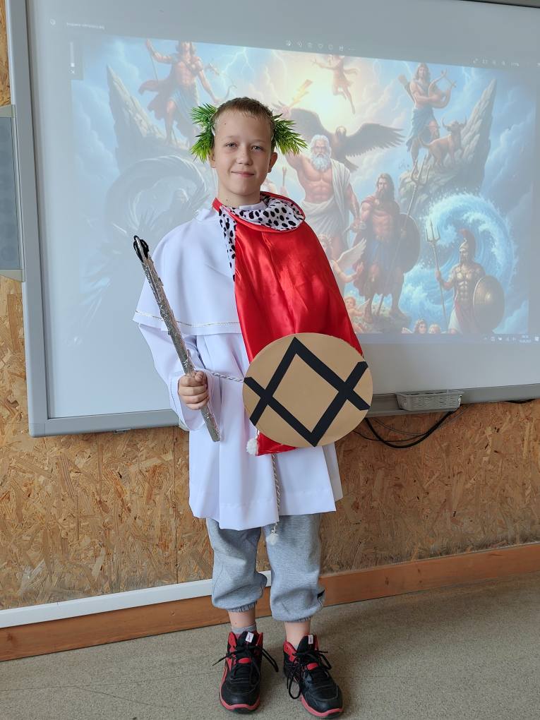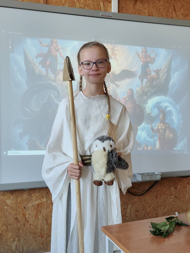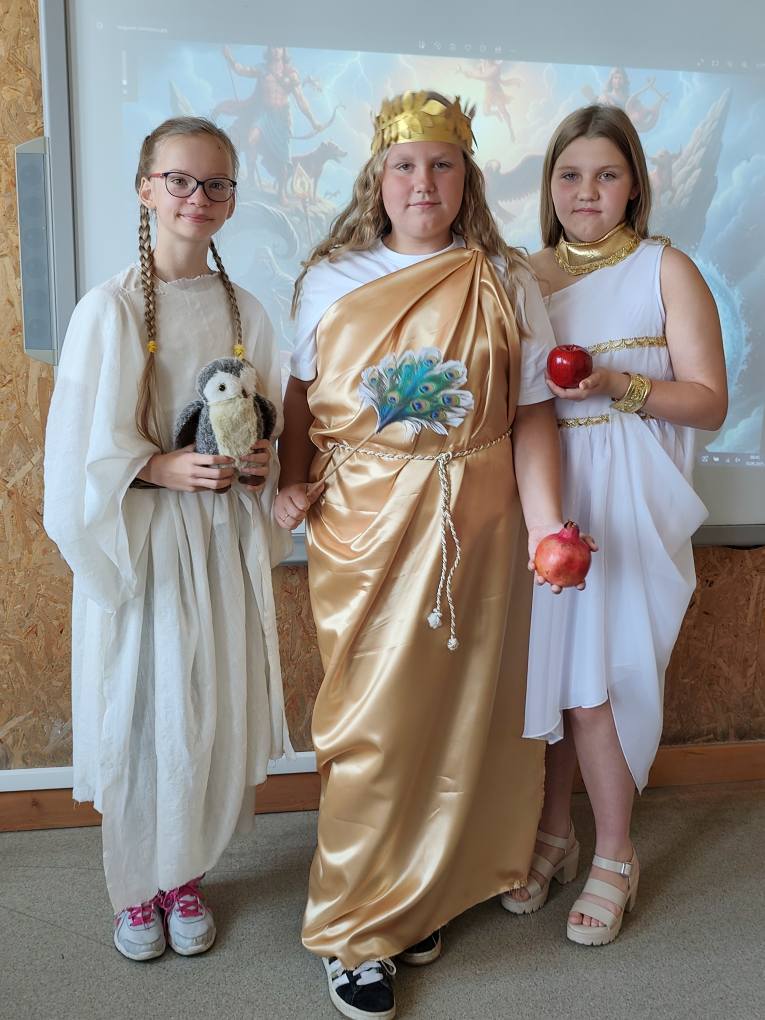 Jak co roku we wrześniu klasa 5 rozpoczyna swoją przygodę z mitologią grecką wielką prezentacją bogow olimpijskich. Ta niezwykła lekcja, pełna emocji związanych z odkrywaniem relacji między mitologicznymi postaciami, pozwala zapamiętać na lata przygody i atrybuty bogów. Świat greckiej mitologii to jeden z ważnych fundamentów kultury śródziemnomorskiej, której jesteśmy spadkobiercami. Klasa 5 rewelacyjnie przygotowała się do prezentacji, zbierając informacje o swoich bohaterach i wcielając się w nich przebraniem i przyniesionymi atrybutami. Wielka olimpijska rodzina przedstawiła się także uczniom klas 1 – 3 oraz zafundowała powtórkę z mitologii klasie 8. Okazało się, że najstarsi uczniowie sporo pamiętają z lekcji, którą trzy lata temu sami przerabiali. Znakomicie poradzili sobie z uporządkowaniem pozamienianych między bogami atrybutów. Jak widać najlepszą formą nauki jest dobra zabawa!