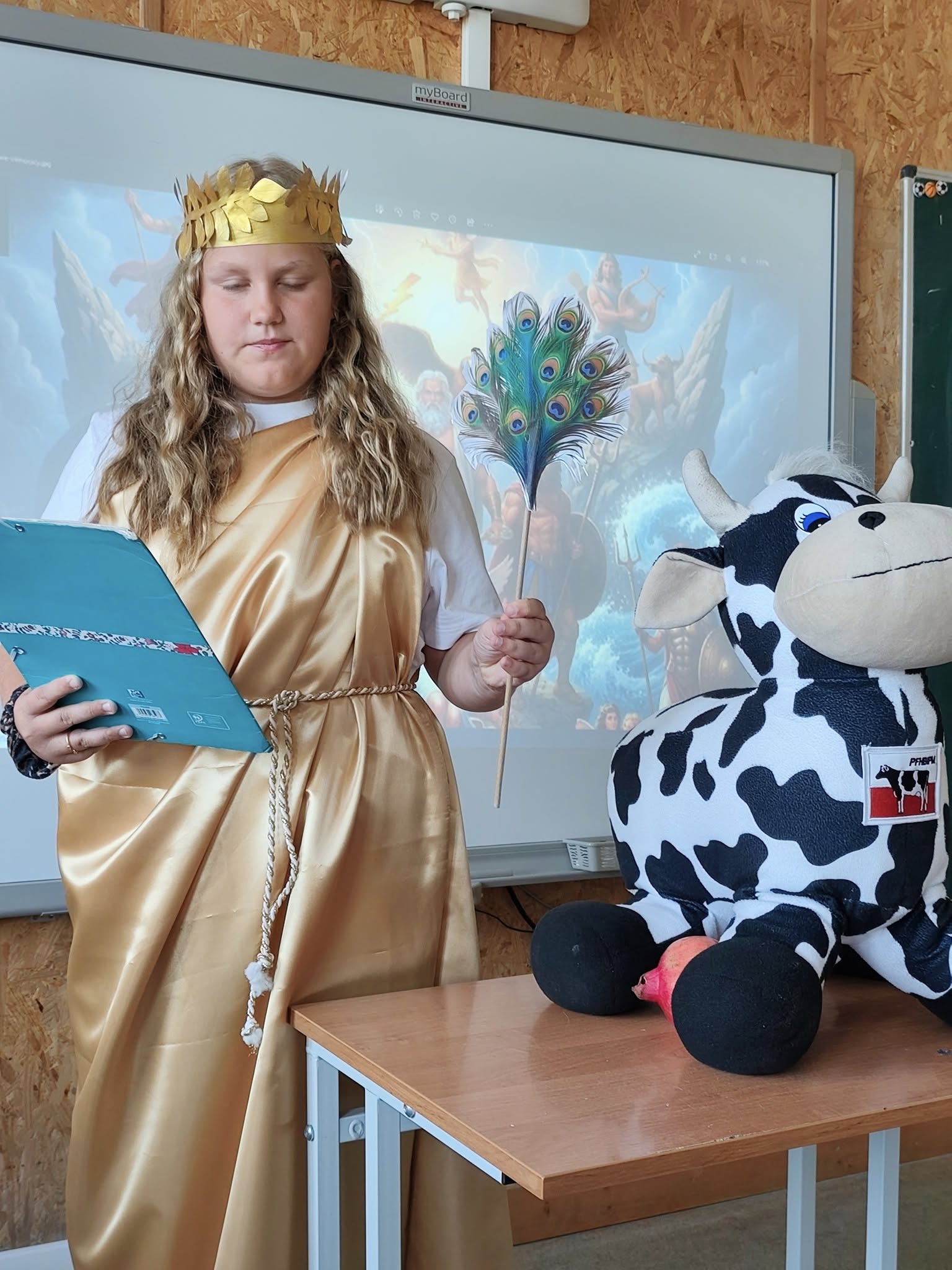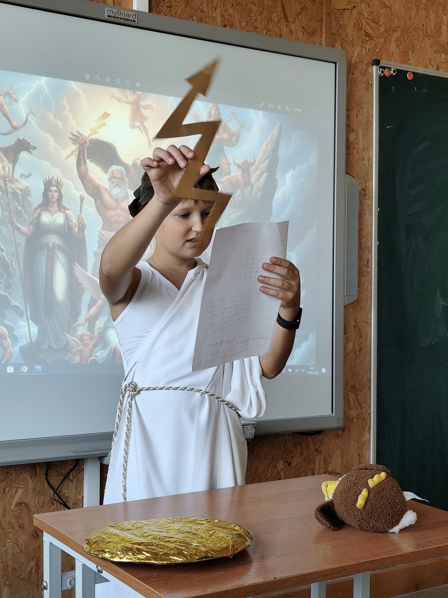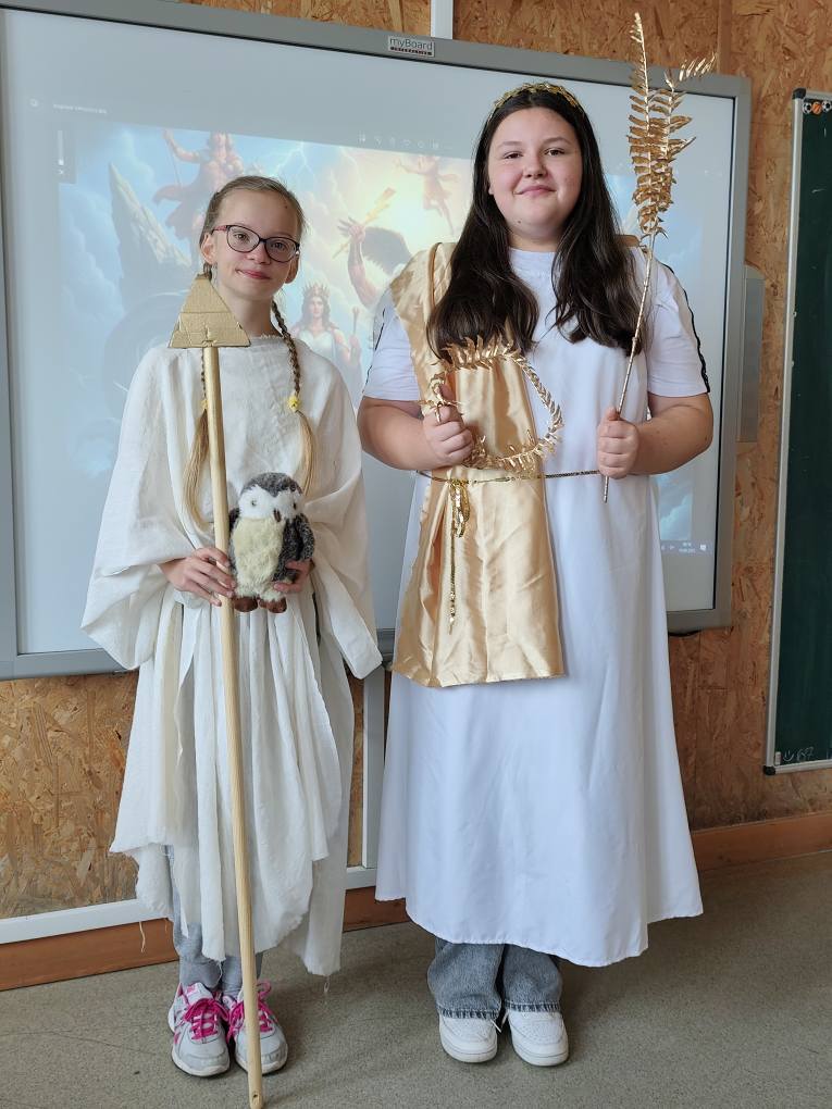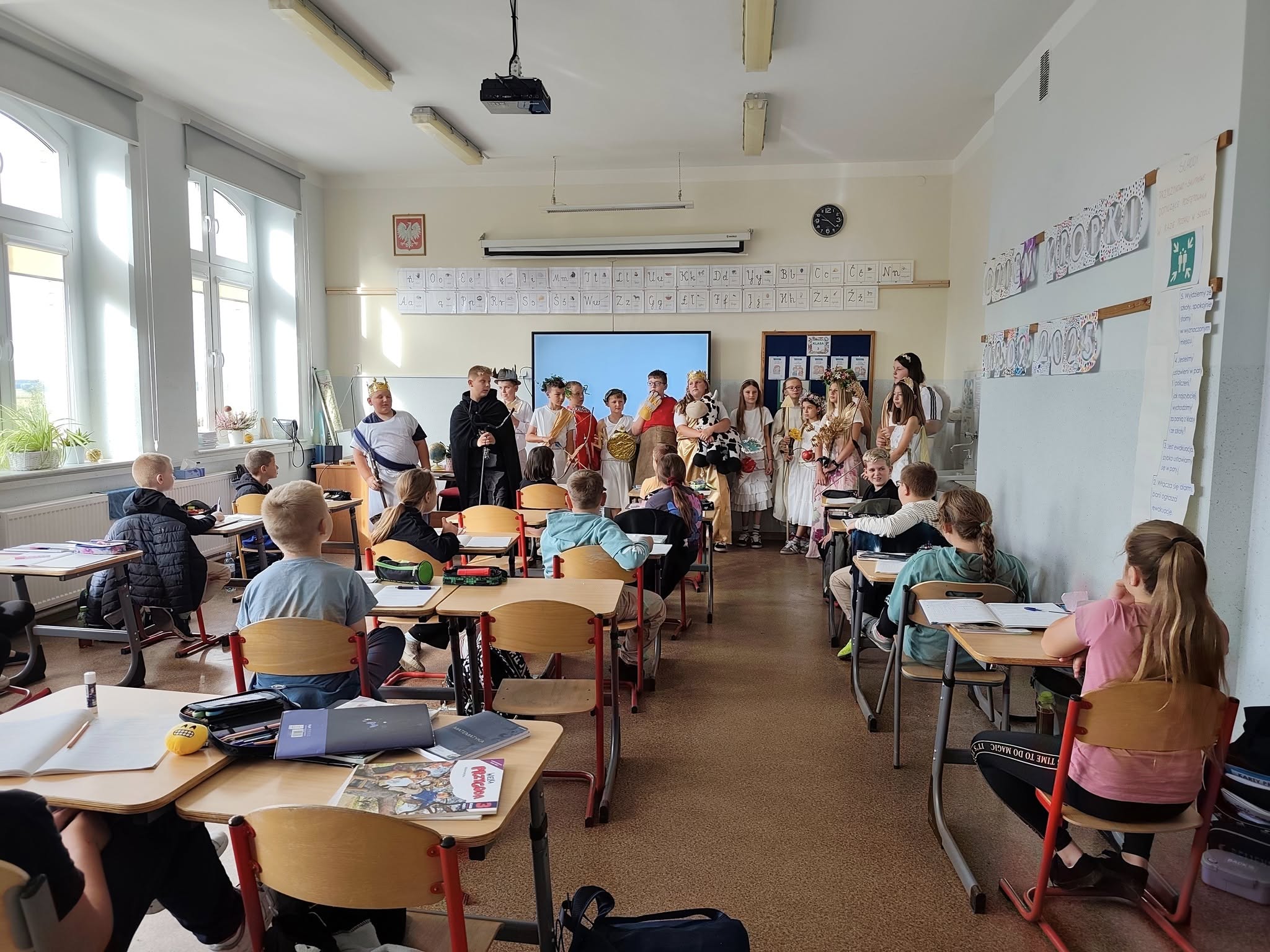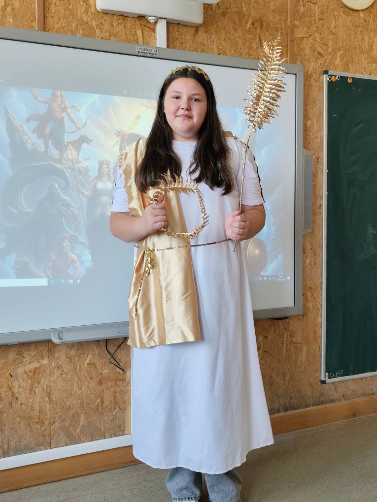 Jak co roku we wrześniu klasa 5 rozpoczyna swoją przygodę z mitologią grecką wielką prezentacją bogow olimpijskich. Ta niezwykła lekcja, pełna emocji związanych z odkrywaniem relacji między mitologicznymi postaciami, pozwala zapamiętać na lata przygody i atrybuty bogów. Świat greckiej mitologii to jeden z ważnych fundamentów kultury śródziemnomorskiej, której jesteśmy spadkobiercami. Klasa 5 rewelacyjnie przygotowała się do prezentacji, zbierając informacje o swoich bohaterach i wcielając się w nich przebraniem i przyniesionymi atrybutami. Wielka olimpijska rodzina przedstawiła się także uczniom klas 1 – 3 oraz zafundowała powtórkę z mitologii klasie 8. Okazało się, że najstarsi uczniowie sporo pamiętają z lekcji, którą trzy lata temu sami przerabiali. Znakomicie poradzili sobie z uporządkowaniem pozamienianych między bogami atrybutów. Jak widać najlepszą formą nauki jest dobra zabawa!