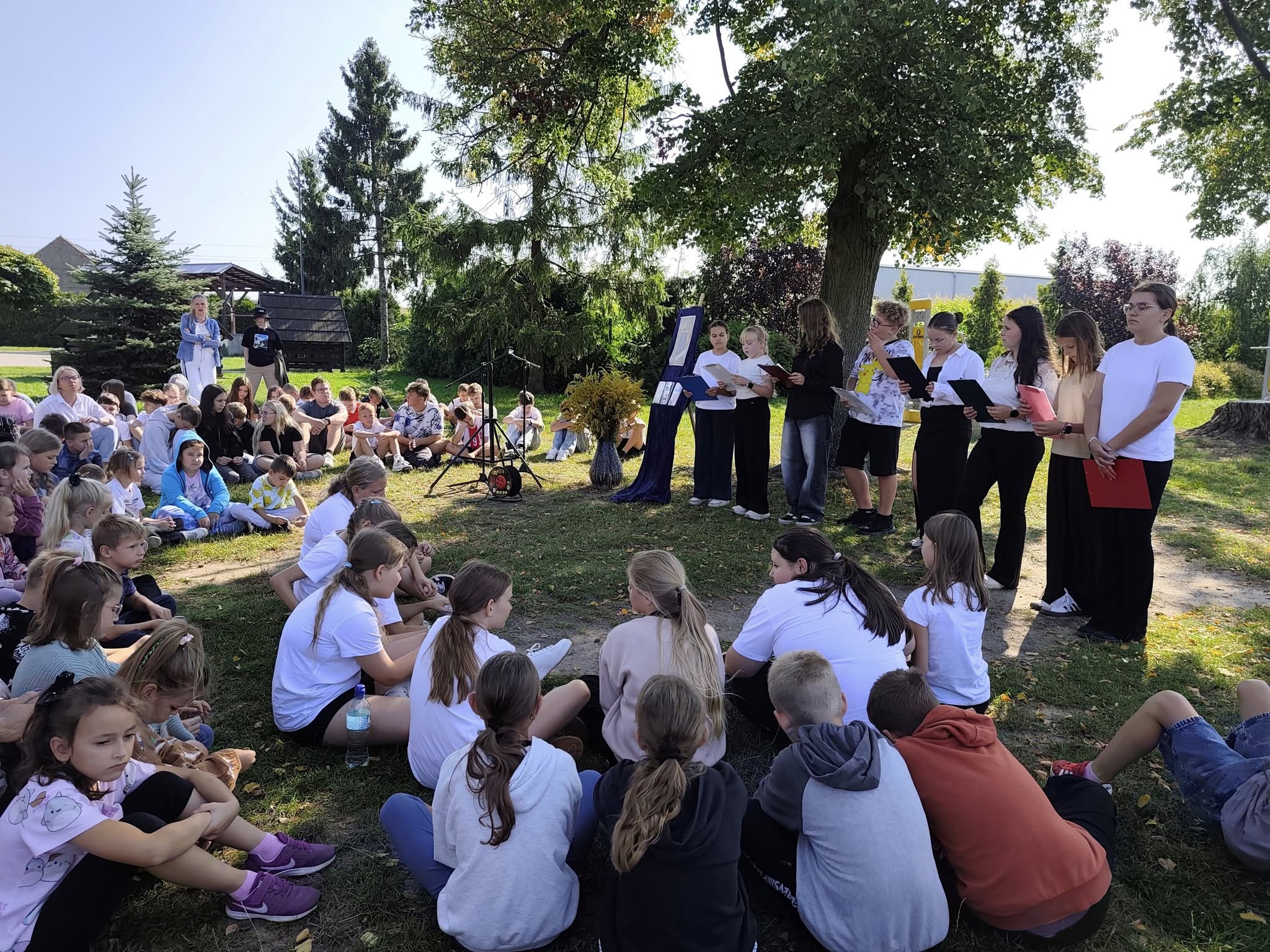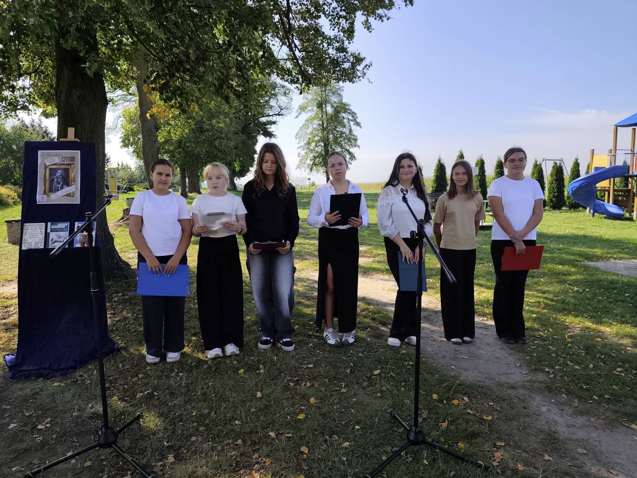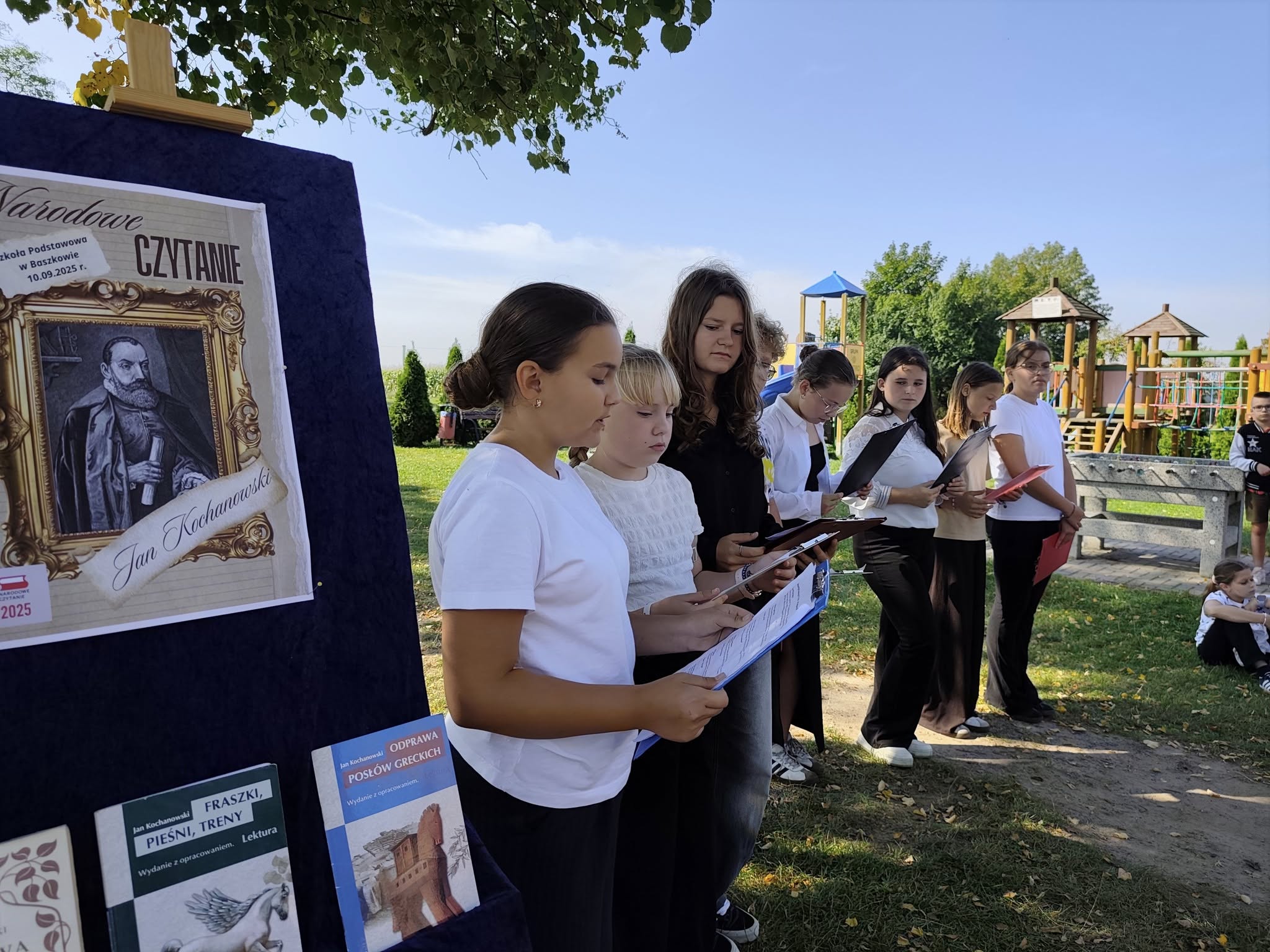 Nasza społeczność wzięła dziś udział w szkolnej odsłonie ogólnopolskiej akcji „Narodowe Czytanie 2025”. Tegoroczna edycja wydarzenia organizowanego pod patronatem Prezydenta Rzeczypospolitej Polskiej poświęcona była poezji Jana Kochanowskiego – renesansowego mistrza poezji i ojca polskiego języka literackiego. Zgodnie z zaproszeniem poety jako goście zasiedliśmy pod lipami, by wysłuchać fragmentów najpopularniejszych fraszek, pieśni i trenów odczytanych przez uczniów kl. 6. Uczniowie poznali twórczość Kochanowskiego pod kątem prawdziwie renesansowej różnorodności jej tematyki.