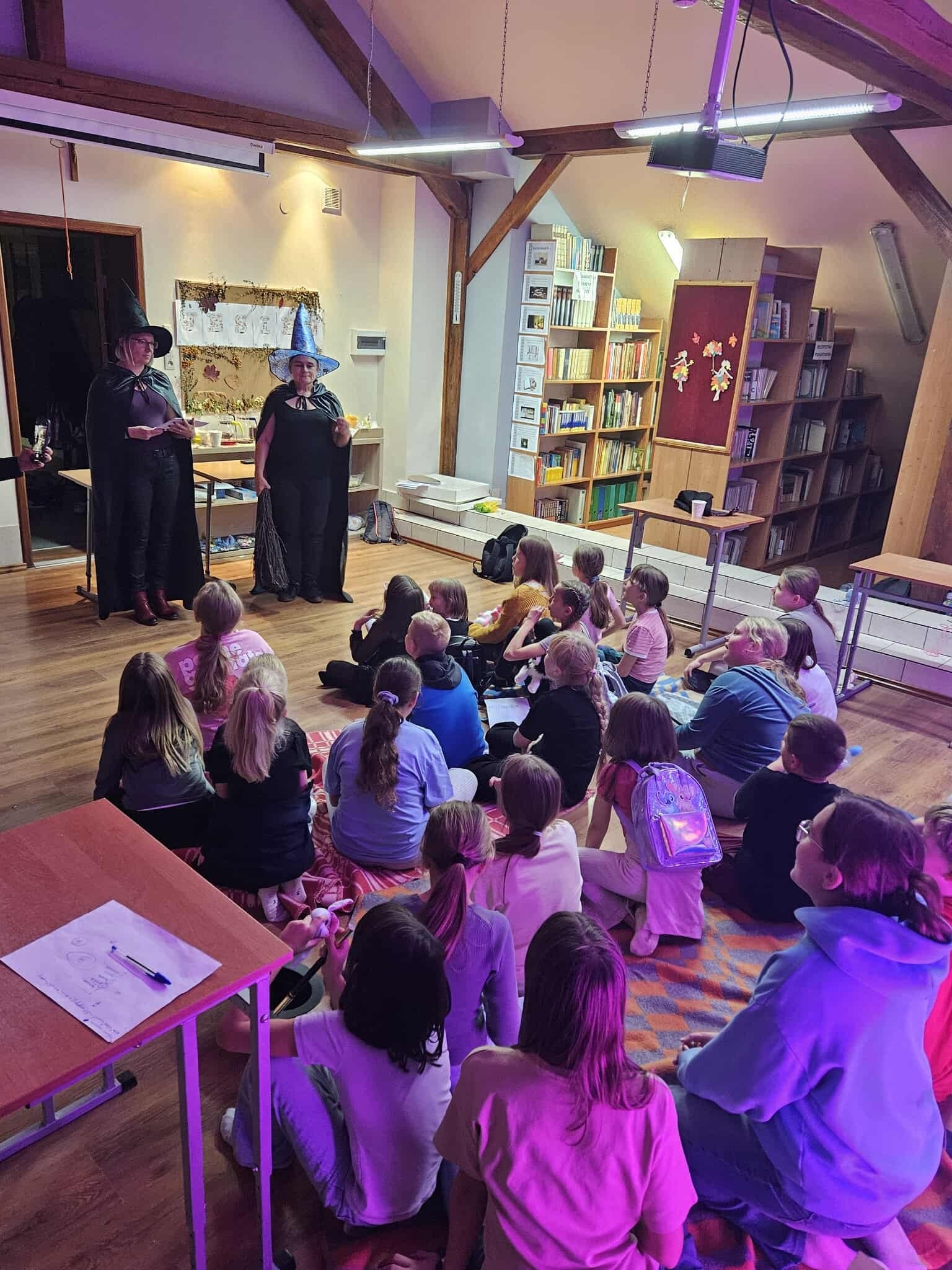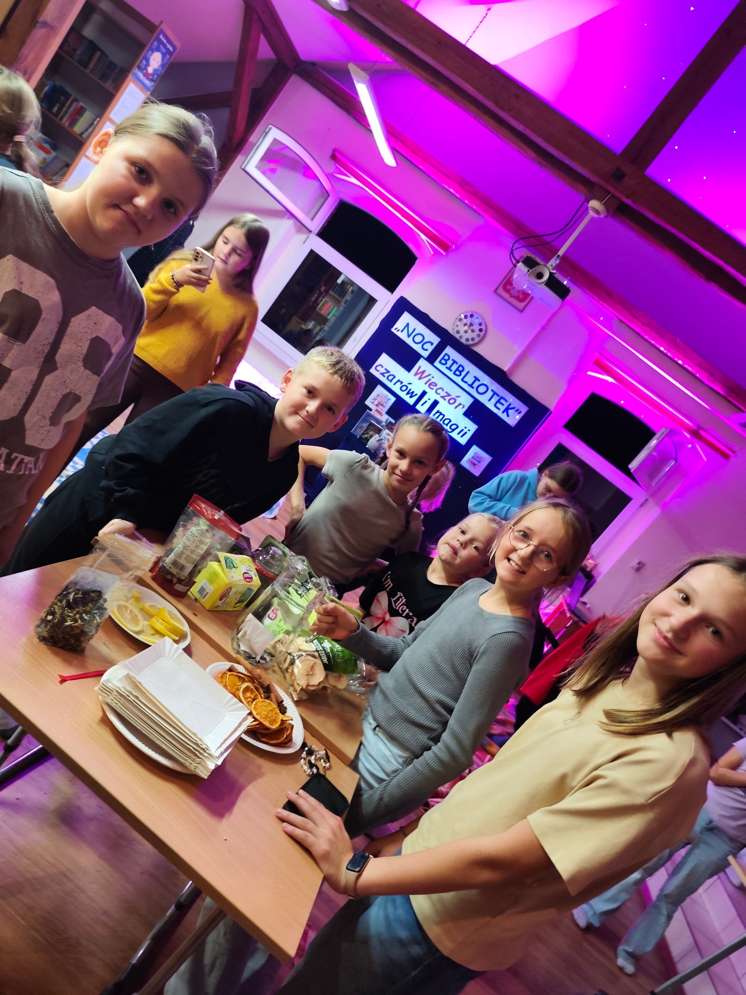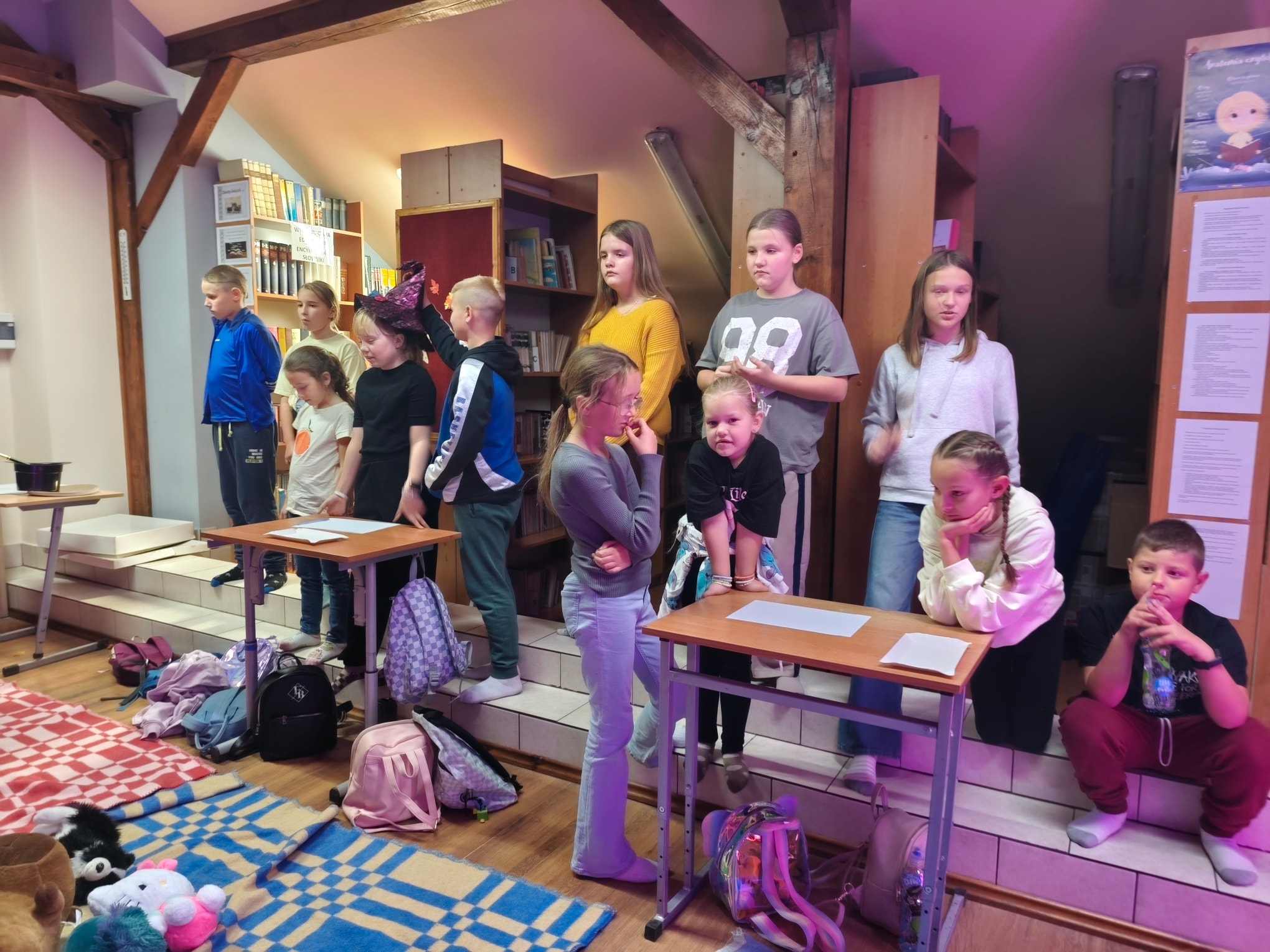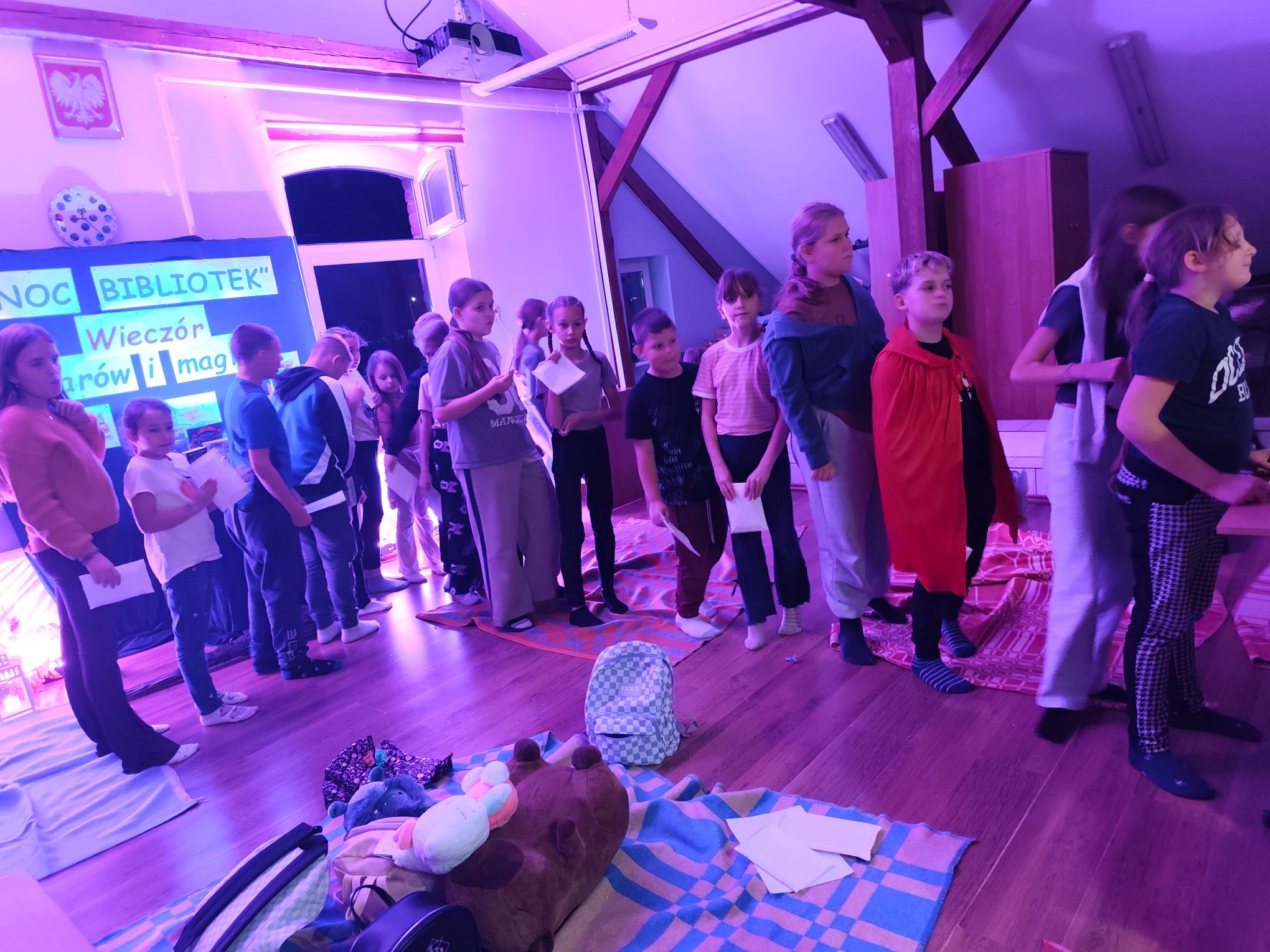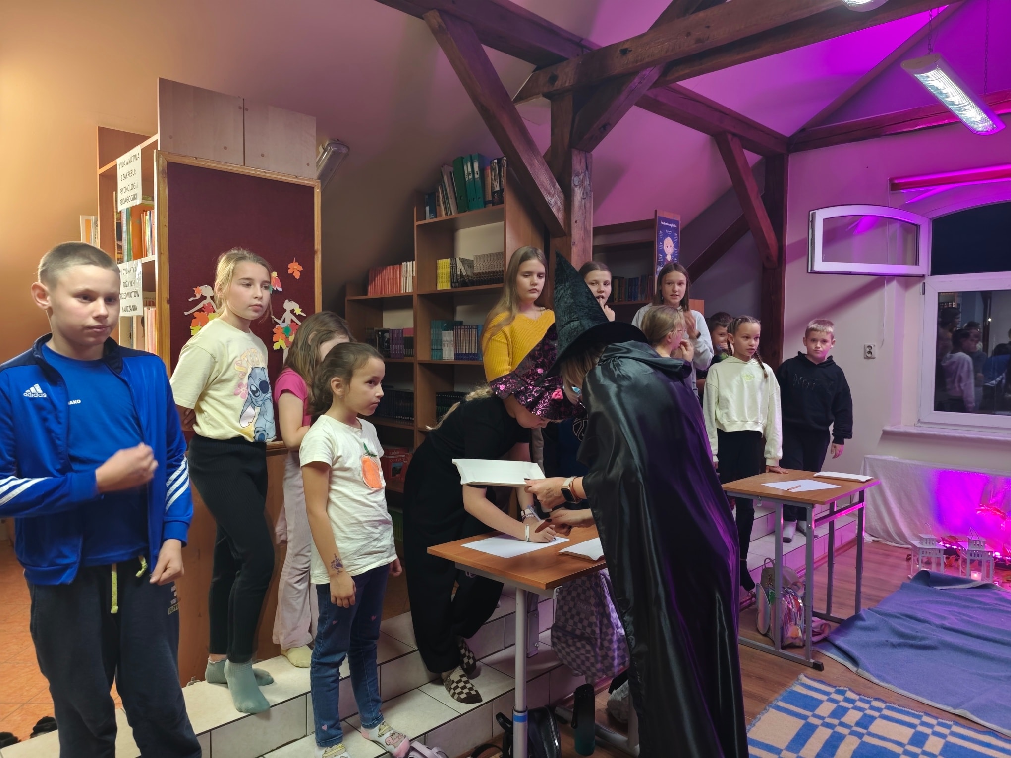 Piątkowy październikowy wieczór (17.10.2025) w szkolnej bibliotece był prawdziwą ucztą czarów i magii przygotowaną z okazji Nocy Bibliotek 2025. Uczniowie, którzy przyjęli wyzwanie wstąpienia do Szkolnej Akademii Magii, znakomicie poradzili sobie z egzaminem wiedzy z zakresu magii w literaturze oraz zadaniami warsztatowymi wyrobu amuletów, rozpoznawania ziół i parzenia eliksirów. Szkolenie młodych adeptów magii prowadziły posiadaczki najwyższego stopnia wtajemniczenia w czary - panie Kasia i Ewa przy asystenturze pani Kingi. O słodkie punkty za wiedzę i zaangażowanie dzielnie walczyły cztery drużyny pod wodzą swoich kapitanek, najstarszych czarownic. W przerwie intensywnej nauki w SAMie pani Daria - szefowa naszej magicznej szkoły uraczyła wszystkich przepysznymi, oczywiście magicznym ? naleśnikami. Wyczarowała je dla nas w swojej czarodziejskiej kuchni, do złudzenia przypominającej kuchnię Pana Kleksa. Nasza zabawa zakończyła się wręczeniem Certyfikatów Szkolnej Akademii Magii i pasowaniem na wróżki,magów i czarownice.Z wielkim niedosytem uczniowie opuścili naszą bibliotekę, bo zabawa w niej była naprawdę zajmująca i pełna odkryć. I ja tam byłam, eliksiry piłam, a co zobaczyłam, przed Wami odkryłam.