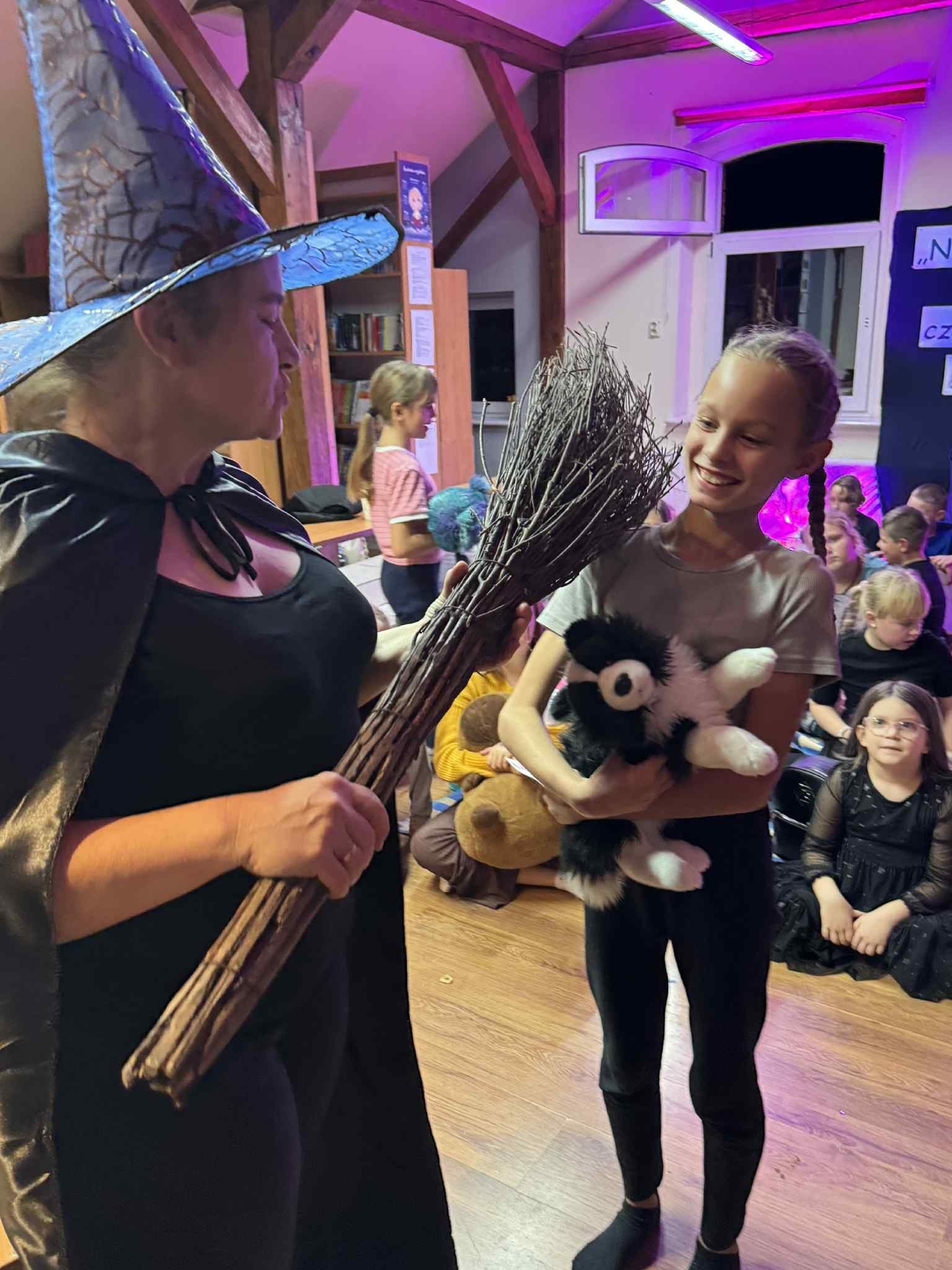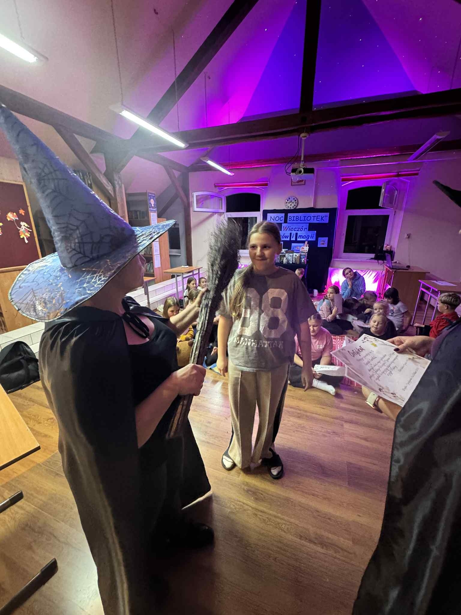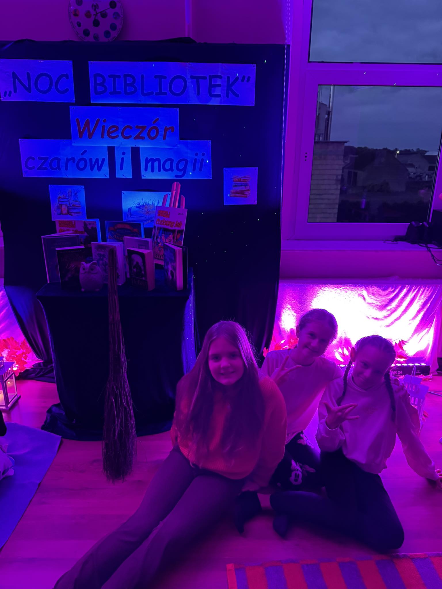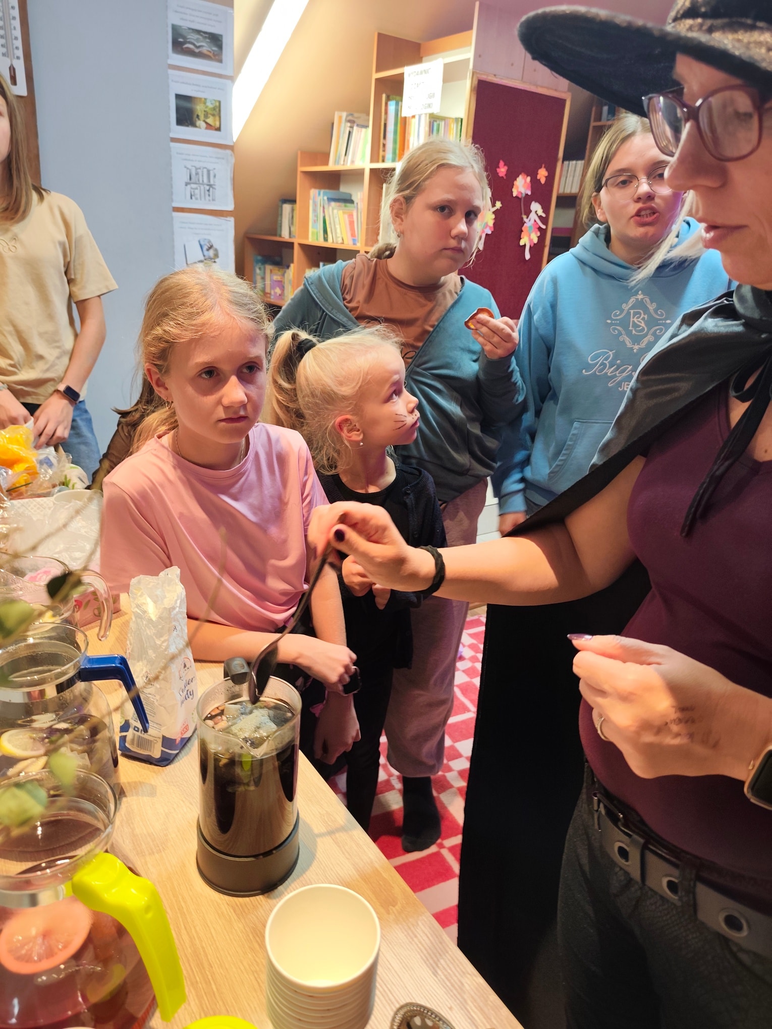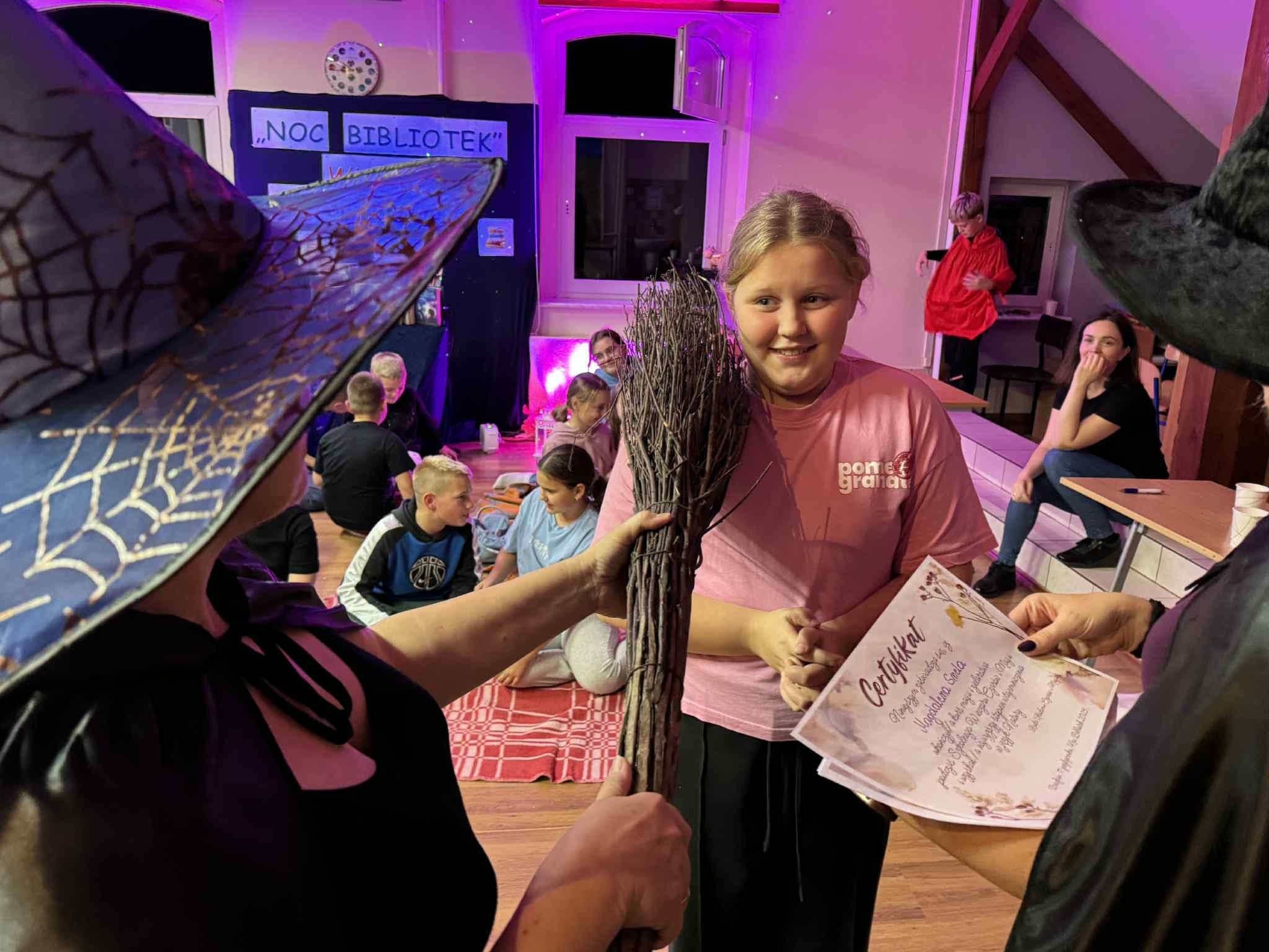 Piątkowy październikowy wieczór (17.10.2025) w szkolnej bibliotece był prawdziwą ucztą czarów i magii przygotowaną z okazji Nocy Bibliotek 2025. Uczniowie, którzy przyjęli wyzwanie wstąpienia do Szkolnej Akademii Magii, znakomicie poradzili sobie z egzaminem wiedzy z zakresu magii w literaturze oraz zadaniami warsztatowymi wyrobu amuletów, rozpoznawania ziół i parzenia eliksirów. Szkolenie młodych adeptów magii prowadziły posiadaczki najwyższego stopnia wtajemniczenia w czary - panie Kasia i Ewa przy asystenturze pani Kingi. O słodkie punkty za wiedzę i zaangażowanie dzielnie walczyły cztery drużyny pod wodzą swoich kapitanek, najstarszych czarownic. W przerwie intensywnej nauki w SAMie pani Daria - szefowa naszej magicznej szkoły uraczyła wszystkich przepysznymi, oczywiście magicznym ? naleśnikami. Wyczarowała je dla nas w swojej czarodziejskiej kuchni, do złudzenia przypominającej kuchnię Pana Kleksa. Nasza zabawa zakończyła się wręczeniem Certyfikatów Szkolnej Akademii Magii i pasowaniem na wróżki,magów i czarownice.Z wielkim niedosytem uczniowie opuścili naszą bibliotekę, bo zabawa w niej była naprawdę zajmująca i pełna odkryć. I ja tam byłam, eliksiry piłam, a co zobaczyłam, przed Wami odkryłam.