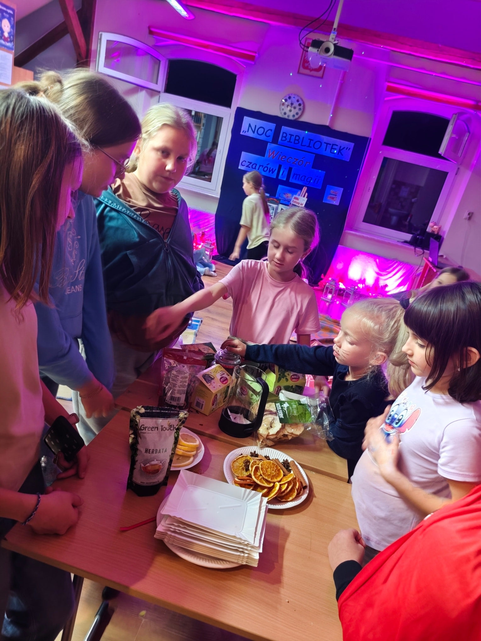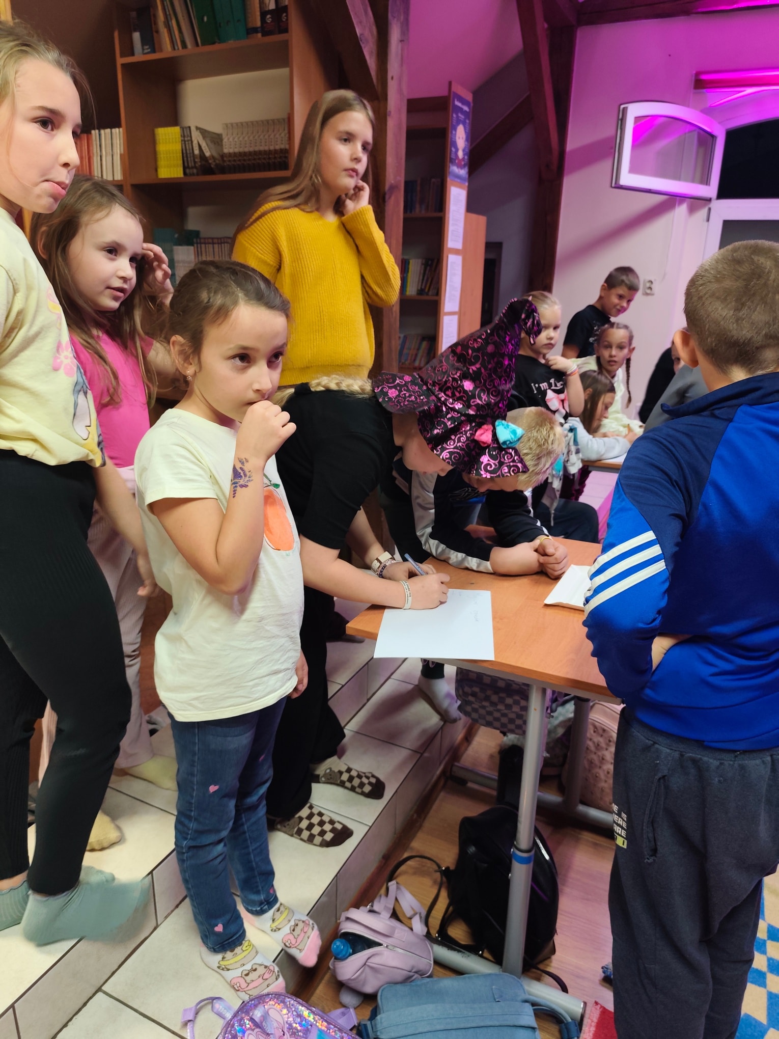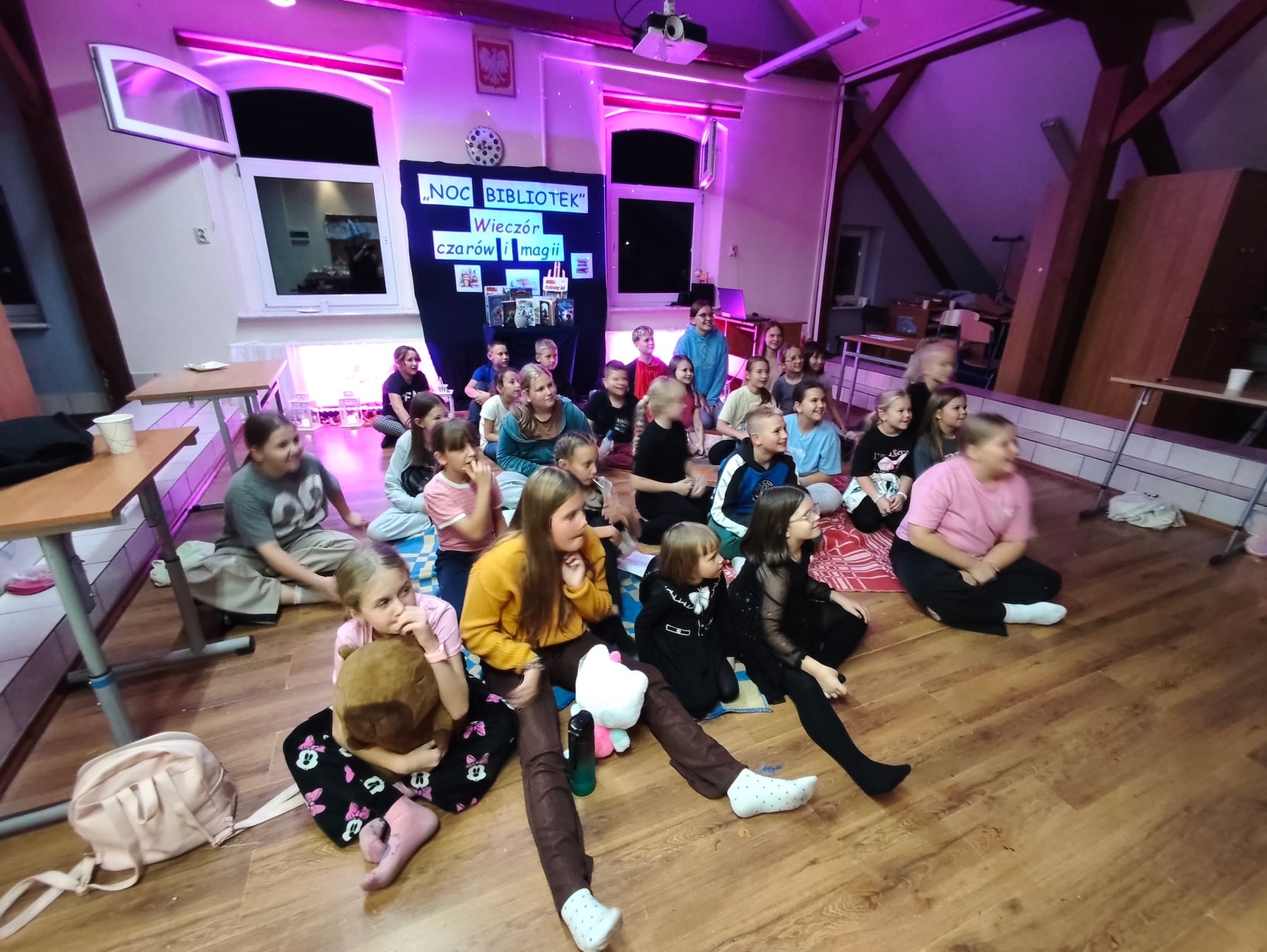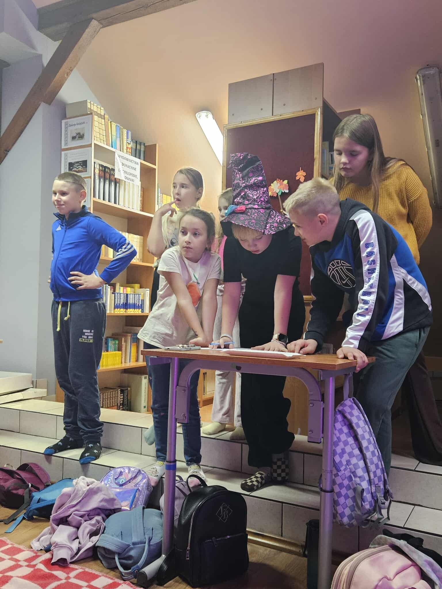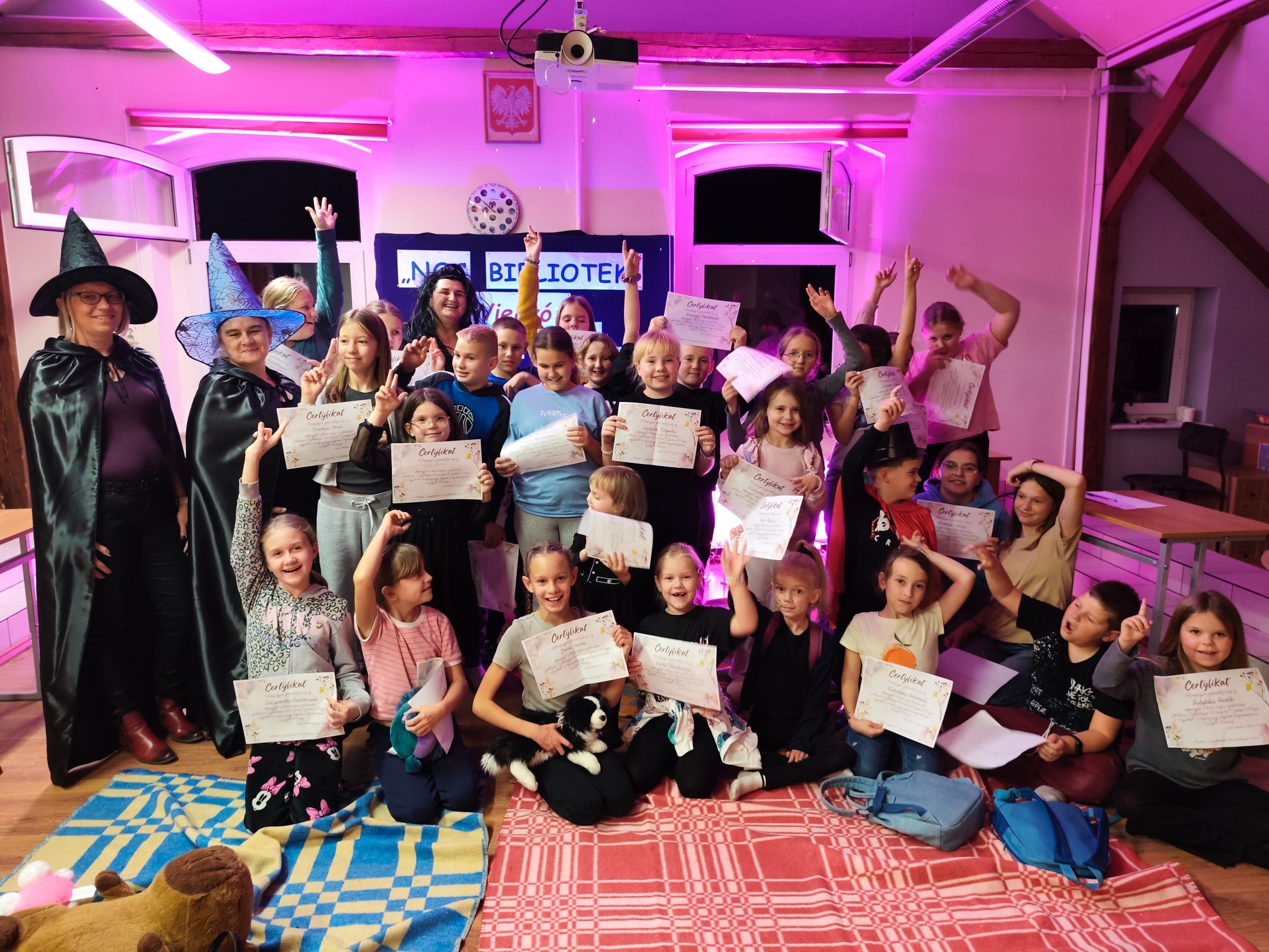 Piątkowy październikowy wieczór (17.10.2025) w szkolnej bibliotece był prawdziwą ucztą czarów i magii przygotowaną z okazji Nocy Bibliotek 2025. Uczniowie, którzy przyjęli wyzwanie wstąpienia do Szkolnej Akademii Magii, znakomicie poradzili sobie z egzaminem wiedzy z zakresu magii w literaturze oraz zadaniami warsztatowymi wyrobu amuletów, rozpoznawania ziół i parzenia eliksirów. Szkolenie młodych adeptów magii prowadziły posiadaczki najwyższego stopnia wtajemniczenia w czary - panie Kasia i Ewa przy asystenturze pani Kingi. O słodkie punkty za wiedzę i zaangażowanie dzielnie walczyły cztery drużyny pod wodzą swoich kapitanek, najstarszych czarownic. W przerwie intensywnej nauki w SAMie pani Daria - szefowa naszej magicznej szkoły uraczyła wszystkich przepysznymi, oczywiście magicznym ? naleśnikami. Wyczarowała je dla nas w swojej czarodziejskiej kuchni, do złudzenia przypominającej kuchnię Pana Kleksa. Nasza zabawa zakończyła się wręczeniem Certyfikatów Szkolnej Akademii Magii i pasowaniem na wróżki,magów i czarownice.Z wielkim niedosytem uczniowie opuścili naszą bibliotekę, bo zabawa w niej była naprawdę zajmująca i pełna odkryć. I ja tam byłam, eliksiry piłam, a co zobaczyłam, przed Wami odkryłam.