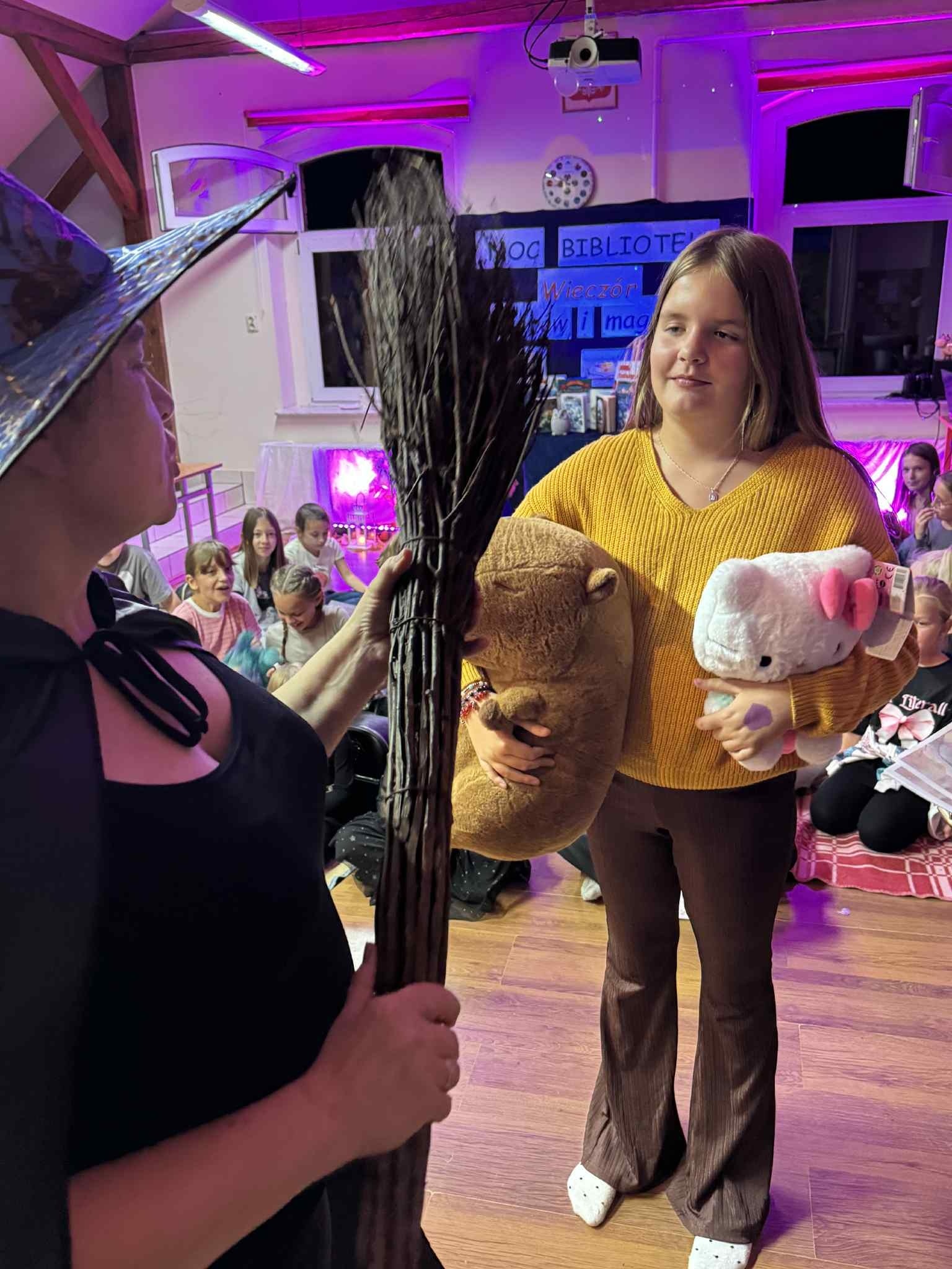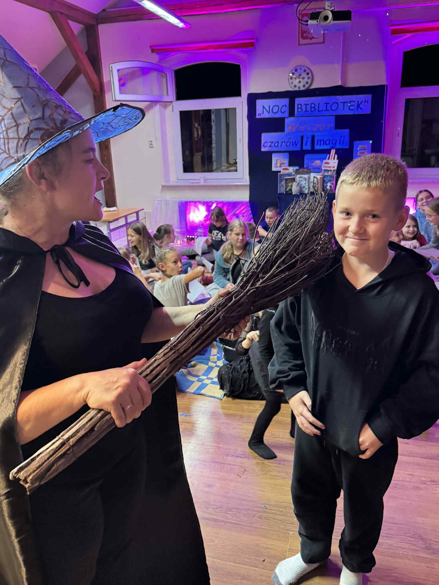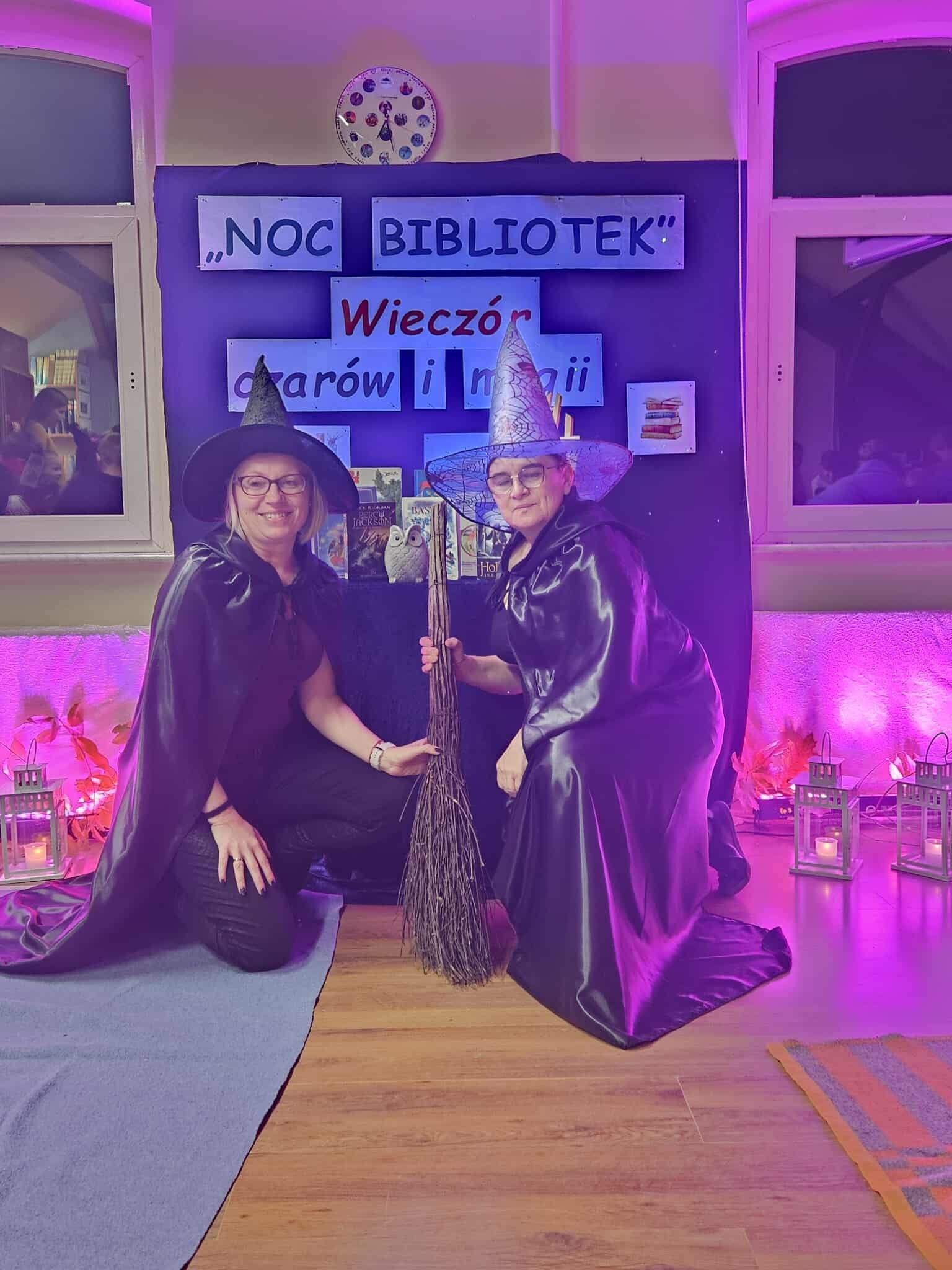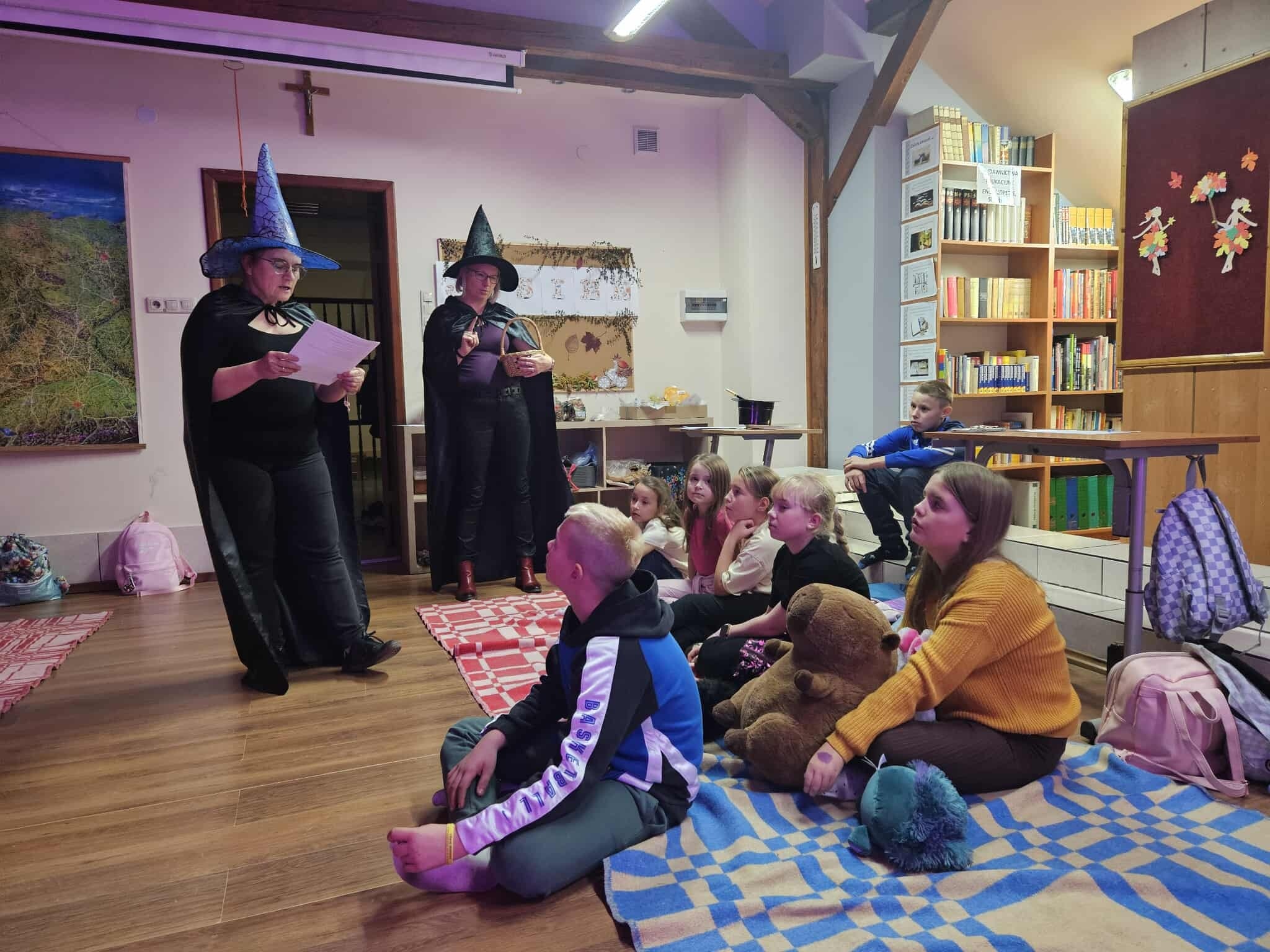 Piątkowy październikowy wieczór (17.10.2025) w szkolnej bibliotece był prawdziwą ucztą czarów i magii przygotowaną z okazji Nocy Bibliotek 2025. Uczniowie, którzy przyjęli wyzwanie wstąpienia do Szkolnej Akademii Magii, znakomicie poradzili sobie z egzaminem wiedzy z zakresu magii w literaturze oraz zadaniami warsztatowymi wyrobu amuletów, rozpoznawania ziół i parzenia eliksirów. Szkolenie młodych adeptów magii prowadziły posiadaczki najwyższego stopnia wtajemniczenia w czary - panie Kasia i Ewa przy asystenturze pani Kingi. O słodkie punkty za wiedzę i zaangażowanie dzielnie walczyły cztery drużyny pod wodzą swoich kapitanek, najstarszych czarownic. W przerwie intensywnej nauki w SAMie pani Daria - szefowa naszej magicznej szkoły uraczyła wszystkich przepysznymi, oczywiście magicznym ? naleśnikami. Wyczarowała je dla nas w swojej czarodziejskiej kuchni, do złudzenia przypominającej kuchnię Pana Kleksa. Nasza zabawa zakończyła się wręczeniem Certyfikatów Szkolnej Akademii Magii i pasowaniem na wróżki,magów i czarownice.Z wielkim niedosytem uczniowie opuścili naszą bibliotekę, bo zabawa w niej była naprawdę zajmująca i pełna odkryć. I ja tam byłam, eliksiry piłam, a co zobaczyłam, przed Wami odkryłam.