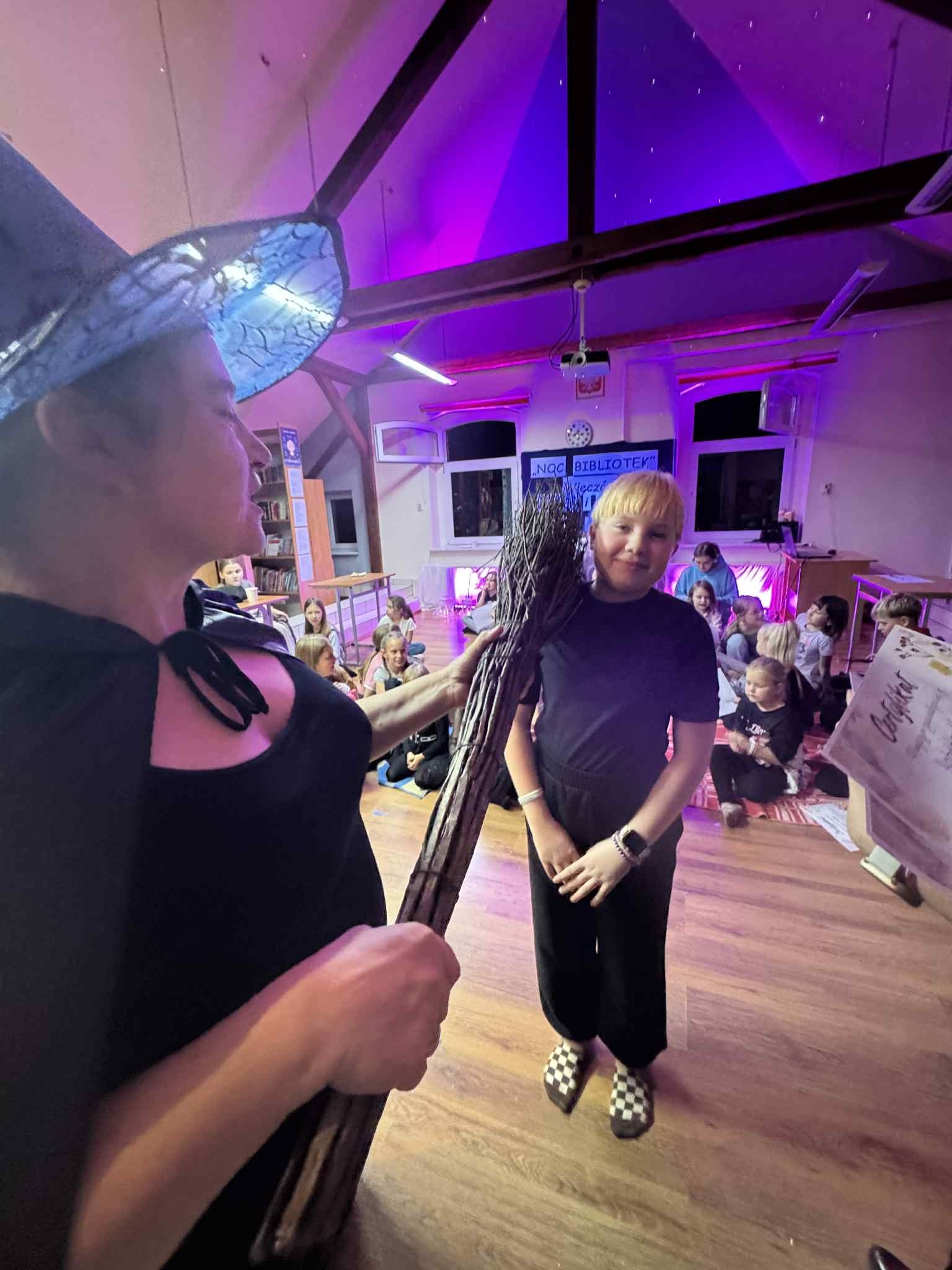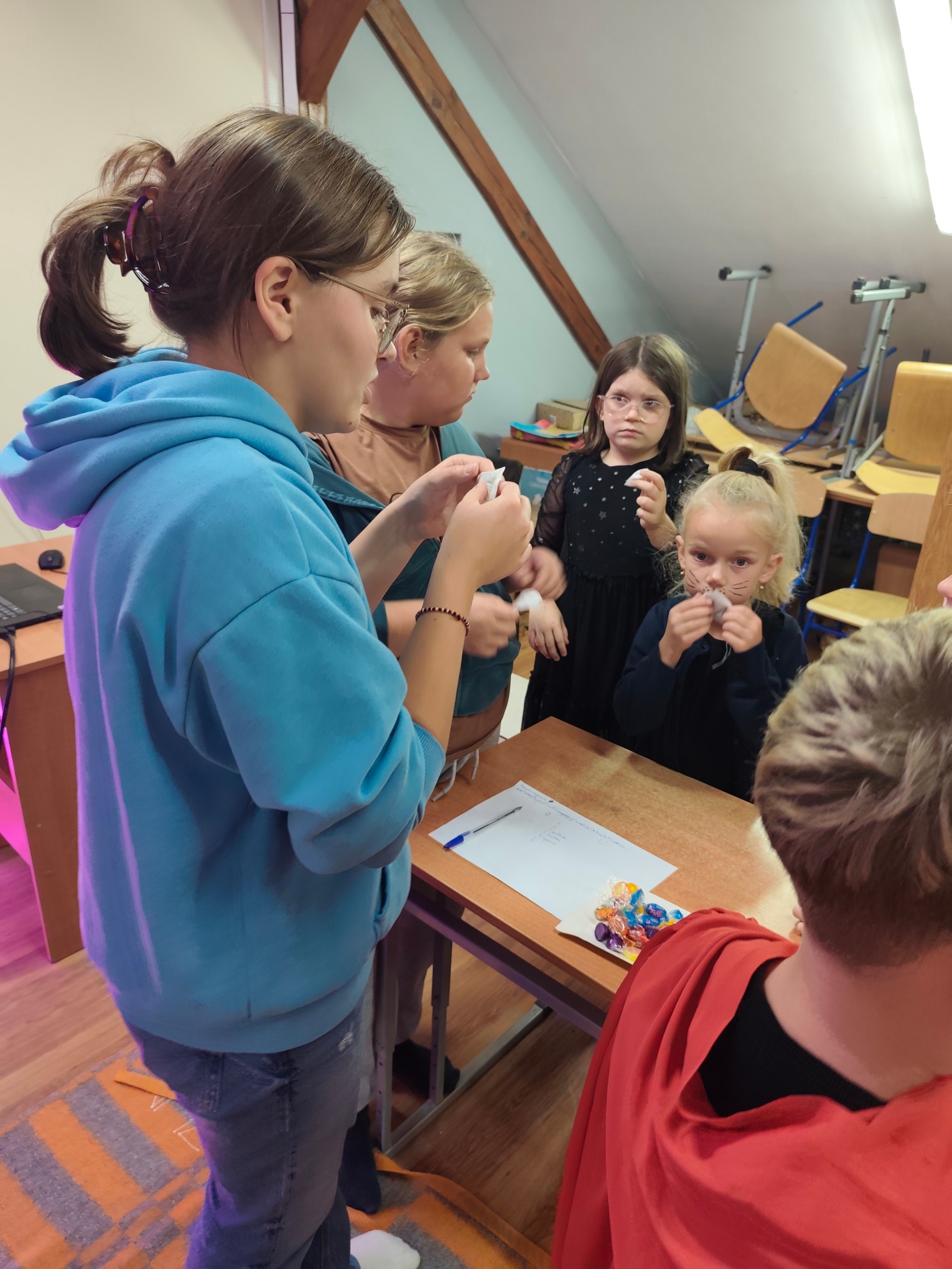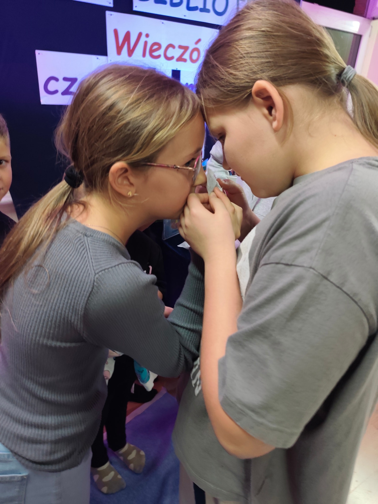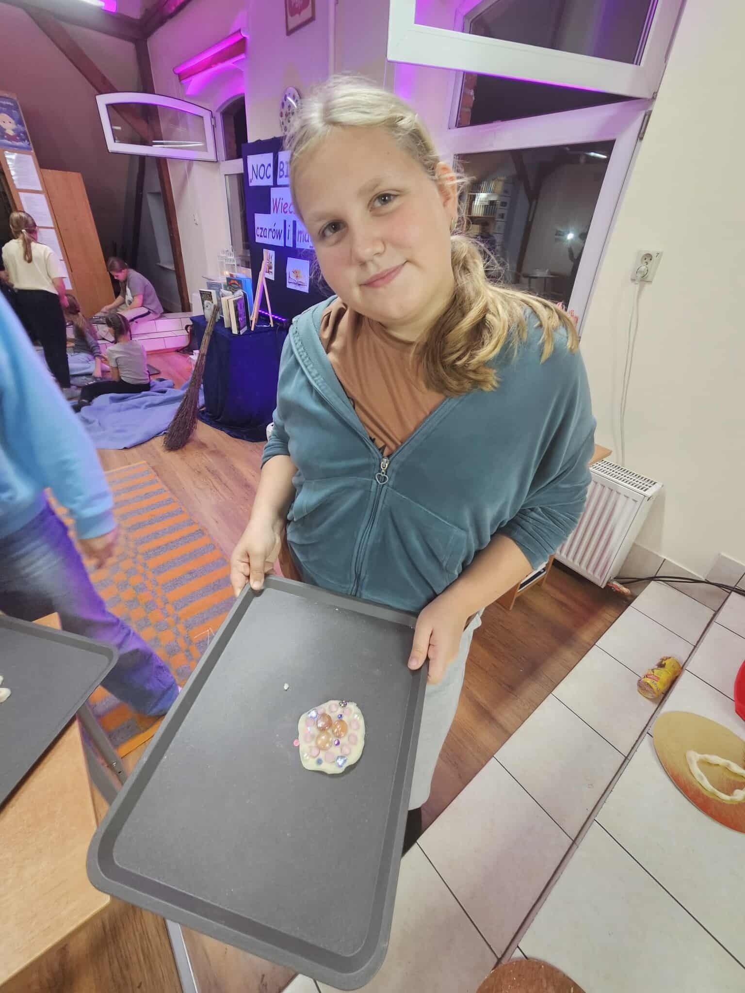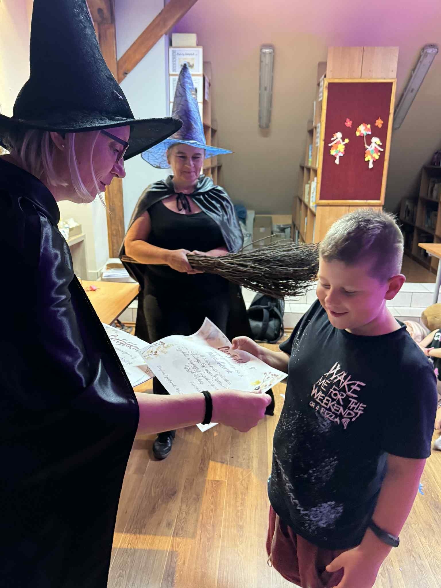 Piątkowy październikowy wieczór (17.10.2025) w szkolnej bibliotece był prawdziwą ucztą czarów i magii przygotowaną z okazji Nocy Bibliotek 2025. Uczniowie, którzy przyjęli wyzwanie wstąpienia do Szkolnej Akademii Magii, znakomicie poradzili sobie z egzaminem wiedzy z zakresu magii w literaturze oraz zadaniami warsztatowymi wyrobu amuletów, rozpoznawania ziół i parzenia eliksirów. Szkolenie młodych adeptów magii prowadziły posiadaczki najwyższego stopnia wtajemniczenia w czary - panie Kasia i Ewa przy asystenturze pani Kingi. O słodkie punkty za wiedzę i zaangażowanie dzielnie walczyły cztery drużyny pod wodzą swoich kapitanek, najstarszych czarownic. W przerwie intensywnej nauki w SAMie pani Daria - szefowa naszej magicznej szkoły uraczyła wszystkich przepysznymi, oczywiście magicznym ? naleśnikami. Wyczarowała je dla nas w swojej czarodziejskiej kuchni, do złudzenia przypominającej kuchnię Pana Kleksa. Nasza zabawa zakończyła się wręczeniem Certyfikatów Szkolnej Akademii Magii i pasowaniem na wróżki,magów i czarownice.Z wielkim niedosytem uczniowie opuścili naszą bibliotekę, bo zabawa w niej była naprawdę zajmująca i pełna odkryć. I ja tam byłam, eliksiry piłam, a co zobaczyłam, przed Wami odkryłam.