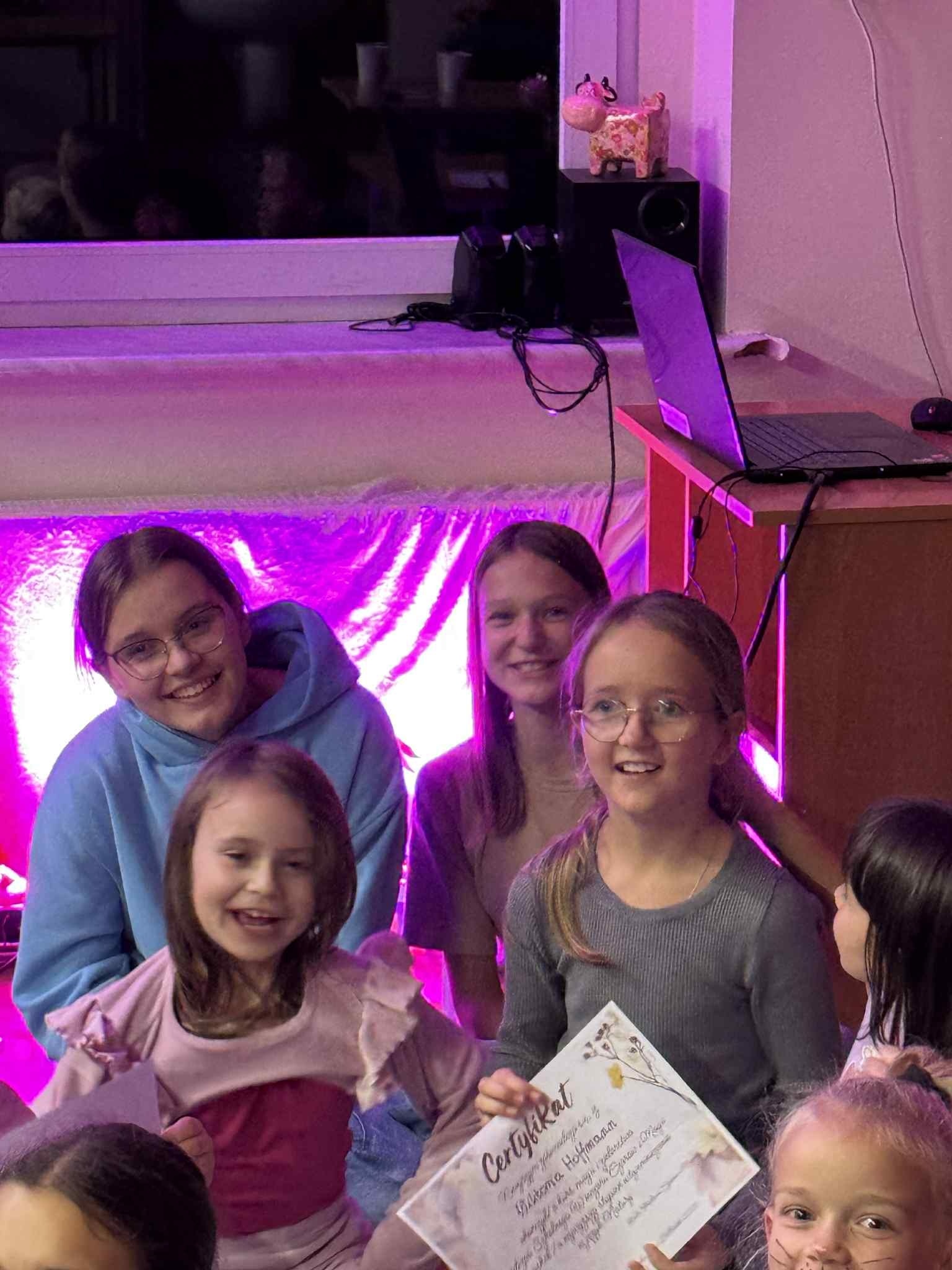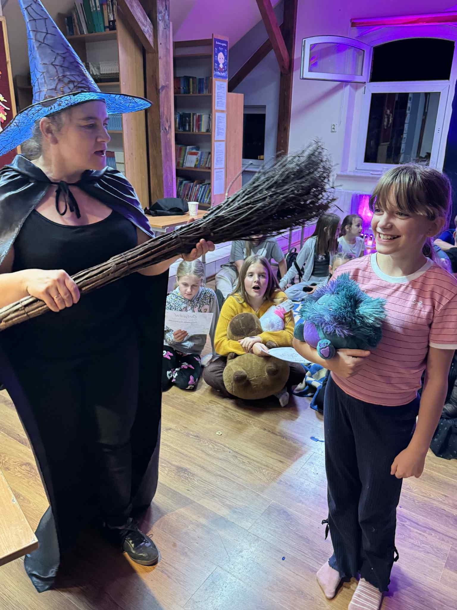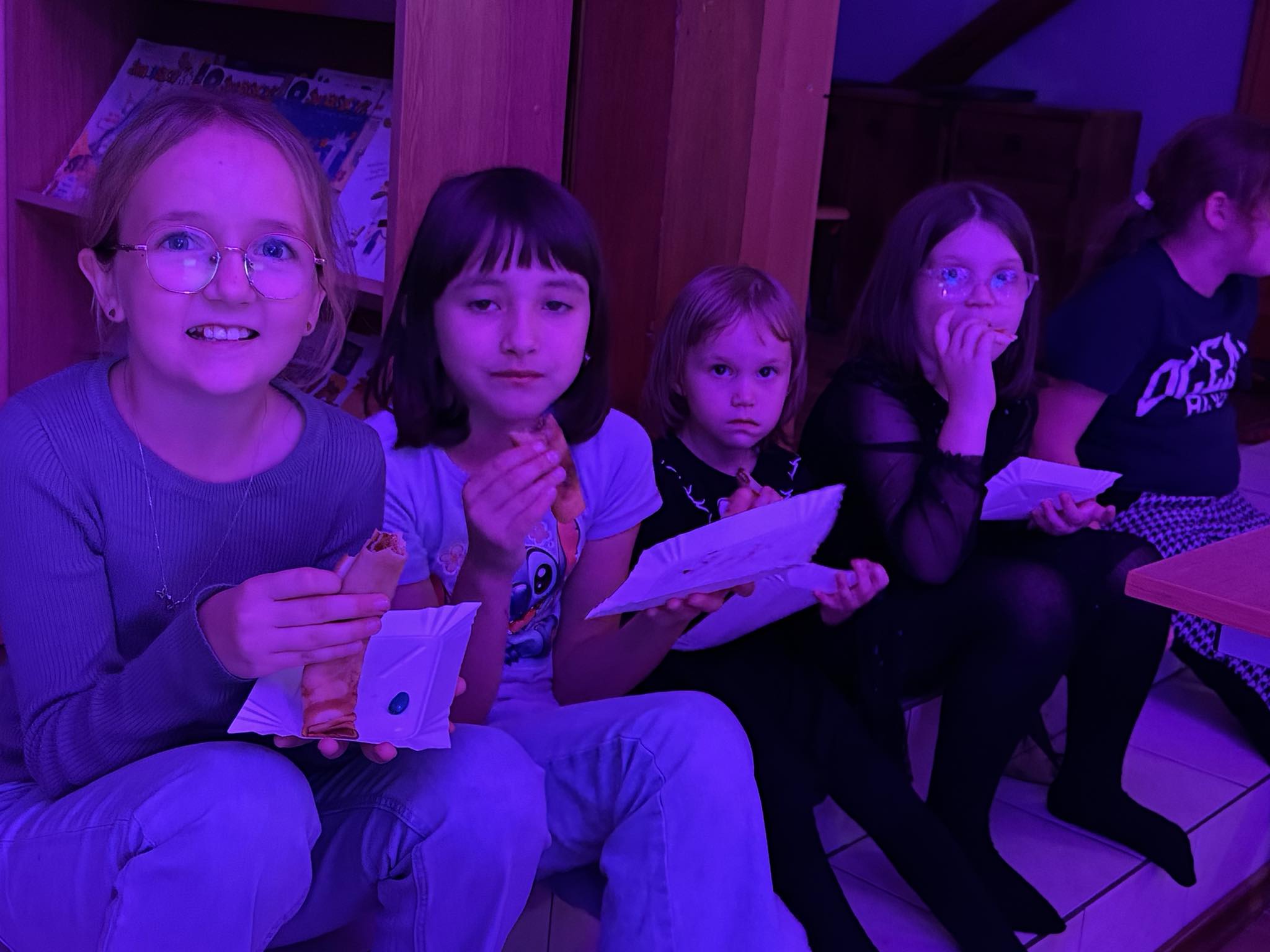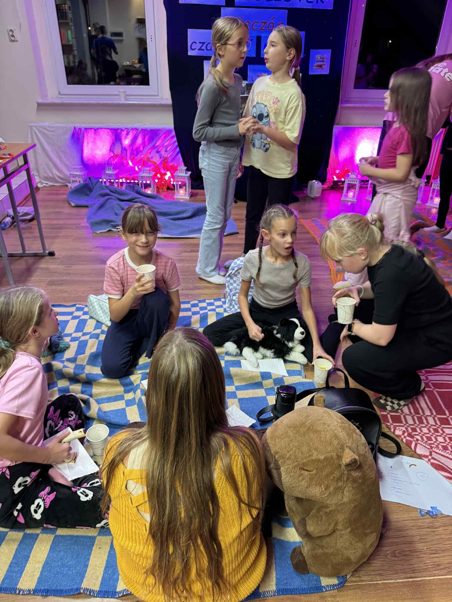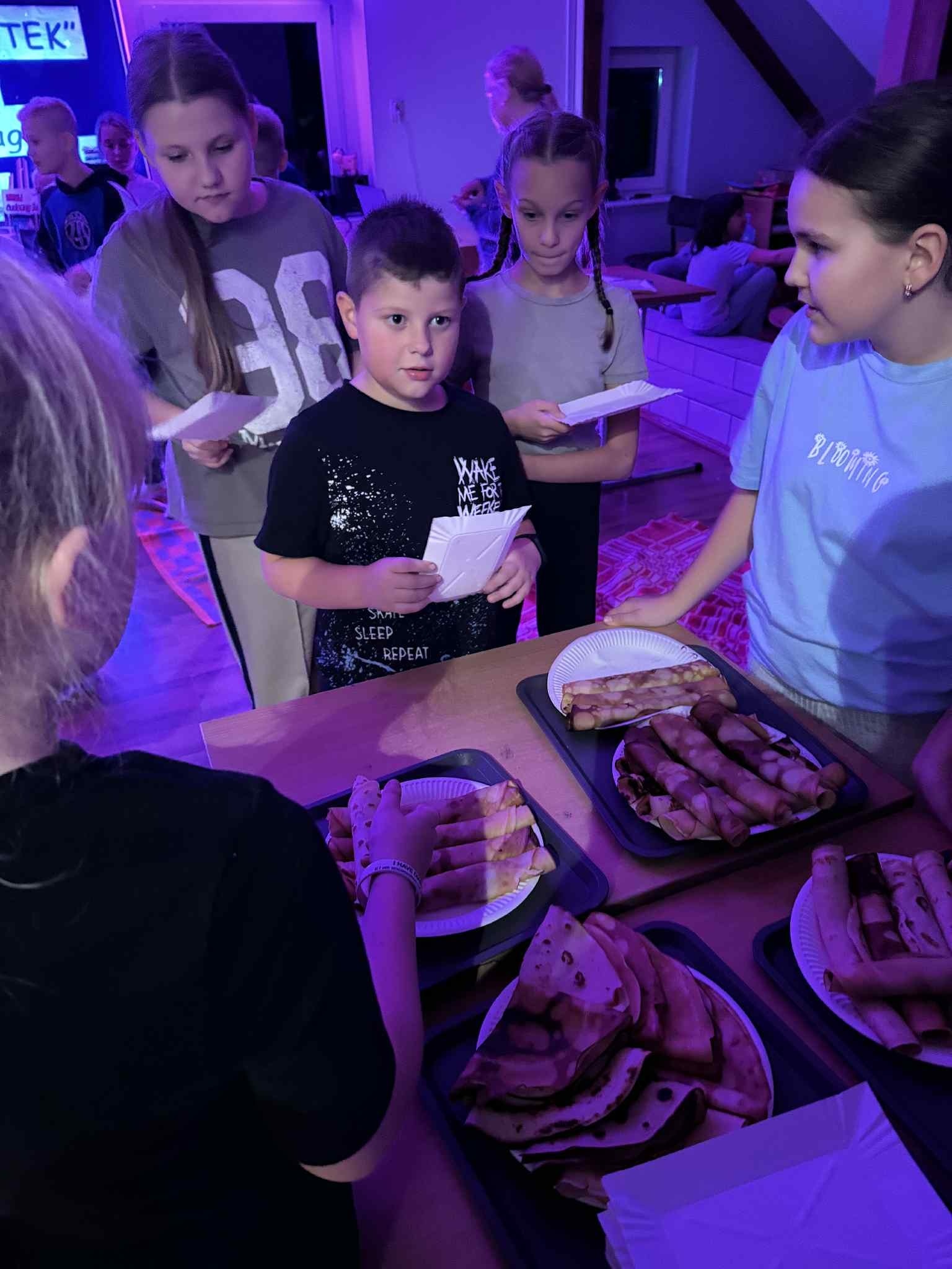 Piątkowy październikowy wieczór (17.10.2025) w szkolnej bibliotece był prawdziwą ucztą czarów i magii przygotowaną z okazji Nocy Bibliotek 2025. Uczniowie, którzy przyjęli wyzwanie wstąpienia do Szkolnej Akademii Magii, znakomicie poradzili sobie z egzaminem wiedzy z zakresu magii w literaturze oraz zadaniami warsztatowymi wyrobu amuletów, rozpoznawania ziół i parzenia eliksirów. Szkolenie młodych adeptów magii prowadziły posiadaczki najwyższego stopnia wtajemniczenia w czary - panie Kasia i Ewa przy asystenturze pani Kingi. O słodkie punkty za wiedzę i zaangażowanie dzielnie walczyły cztery drużyny pod wodzą swoich kapitanek, najstarszych czarownic. W przerwie intensywnej nauki w SAMie pani Daria - szefowa naszej magicznej szkoły uraczyła wszystkich przepysznymi, oczywiście magicznym ? naleśnikami. Wyczarowała je dla nas w swojej czarodziejskiej kuchni, do złudzenia przypominającej kuchnię Pana Kleksa. Nasza zabawa zakończyła się wręczeniem Certyfikatów Szkolnej Akademii Magii i pasowaniem na wróżki,magów i czarownice.Z wielkim niedosytem uczniowie opuścili naszą bibliotekę, bo zabawa w niej była naprawdę zajmująca i pełna odkryć. I ja tam byłam, eliksiry piłam, a co zobaczyłam, przed Wami odkryłam.