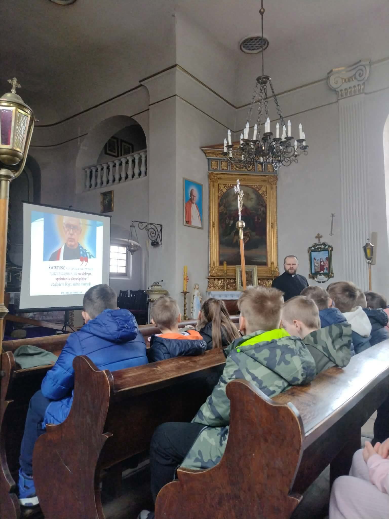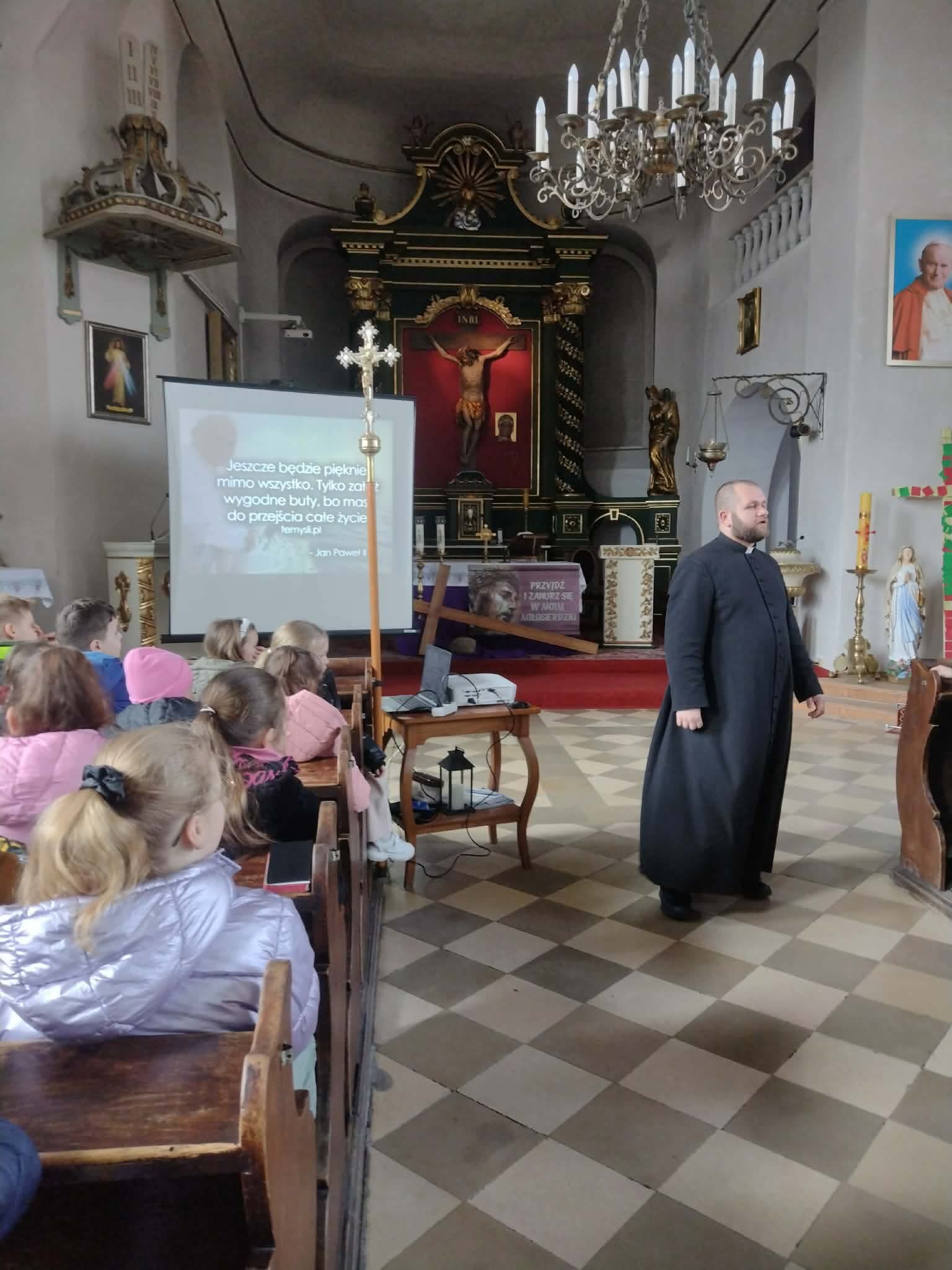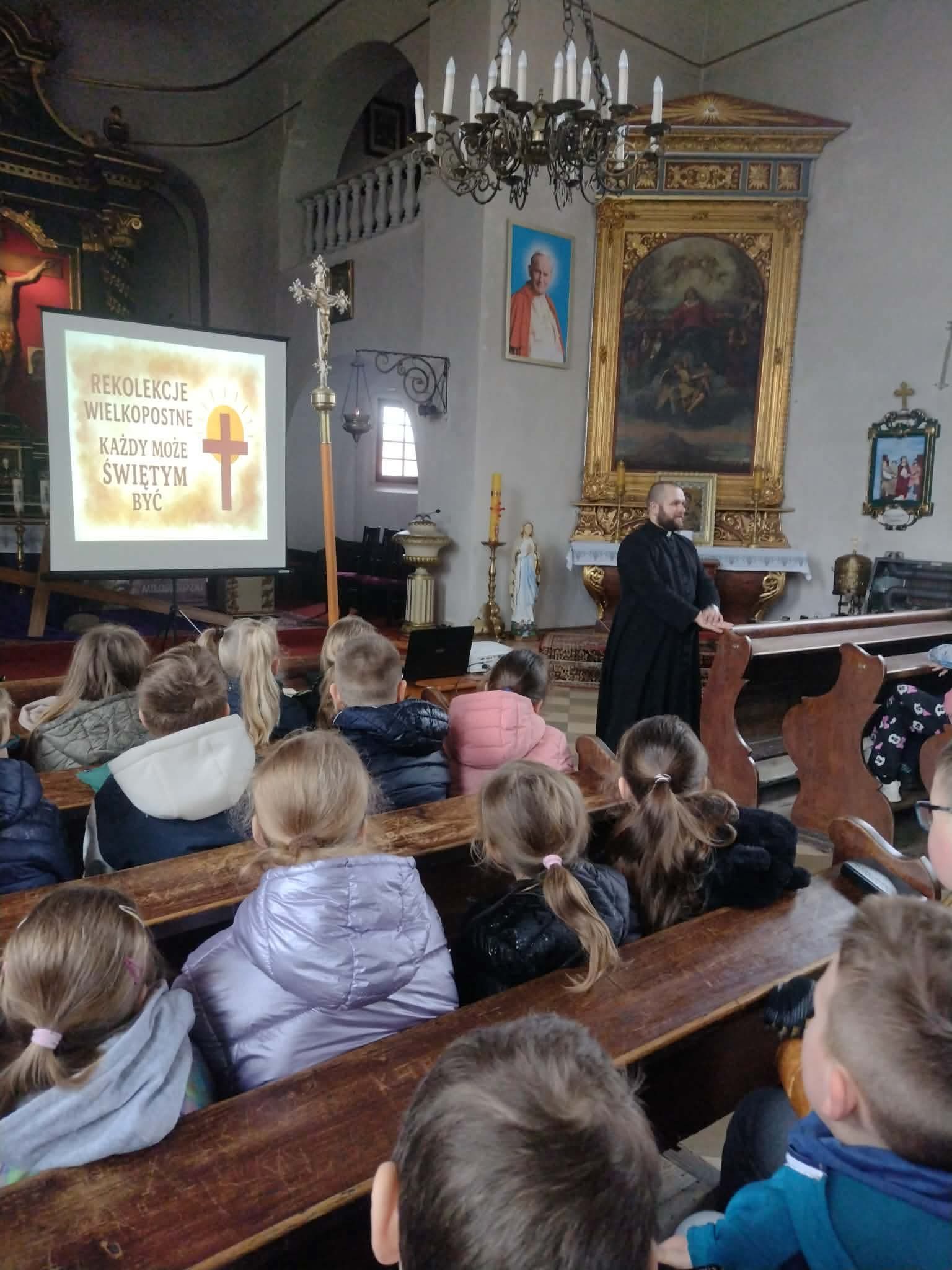 W dniach 16 -18 marca uczniowie naszej szkoły uczestniczyli w rekolekcjach wielkopostnych, które prowadził Ks. Konrad Marzec z sąsiedniej parafii w Zdunach. Hasłem przewodnim naszych spotkań był fragment znanej wszystkim piosenki Arki Noego: "Każdy może Świętym być". Ks. Rekolekcjonista w prostych słowach przekazał dzieciom ważne treści na temat Bożej miłości, siły i mocy modlitwy, różańca oraz dobrych czynów. Pamiętając o tym i wprowadzając w życie wysłuchane nauki małymi krokami podążać będziemy do świętości. Dziękujemy Ks. Konradowi za wygłoszone Słowo.