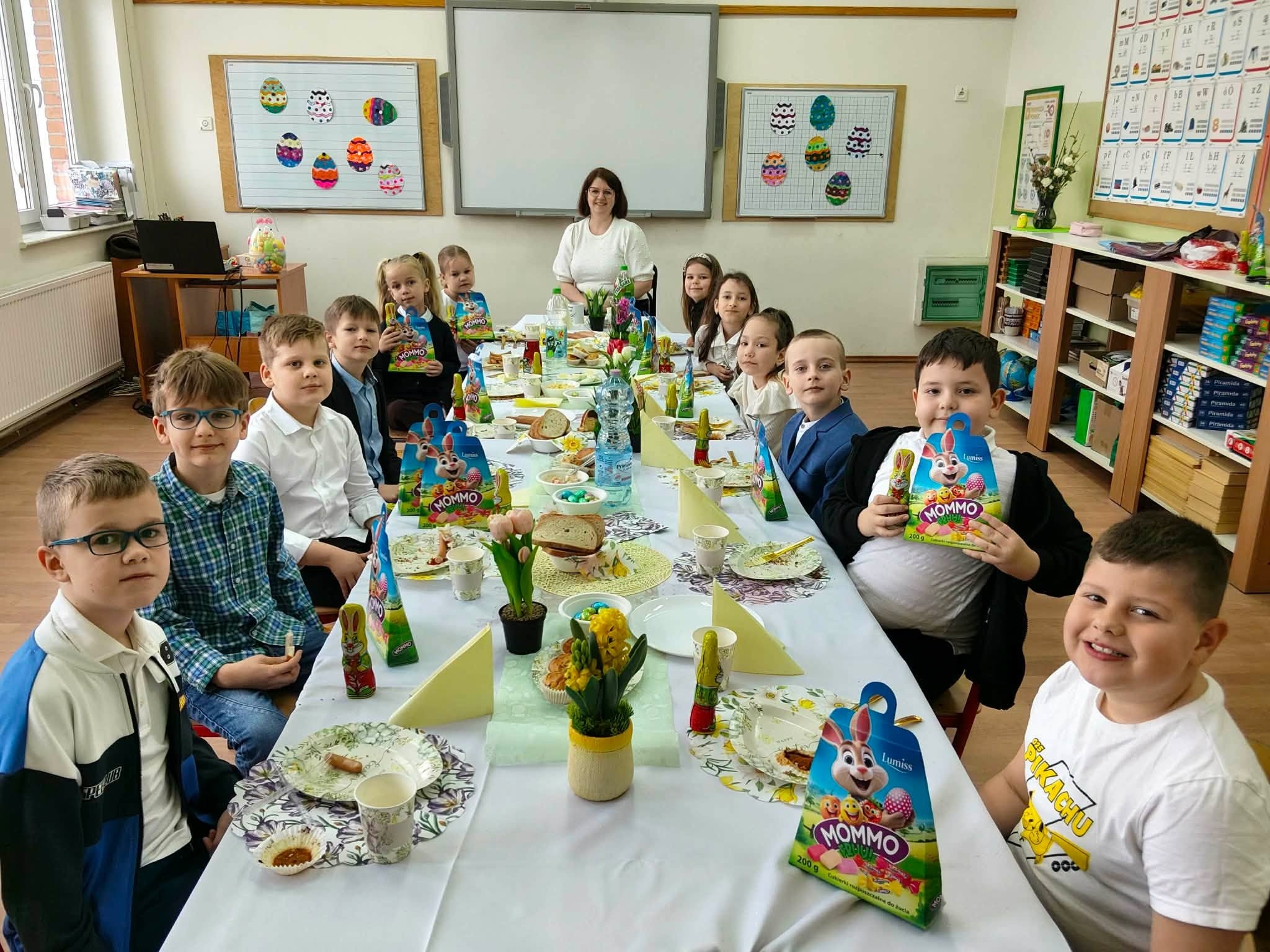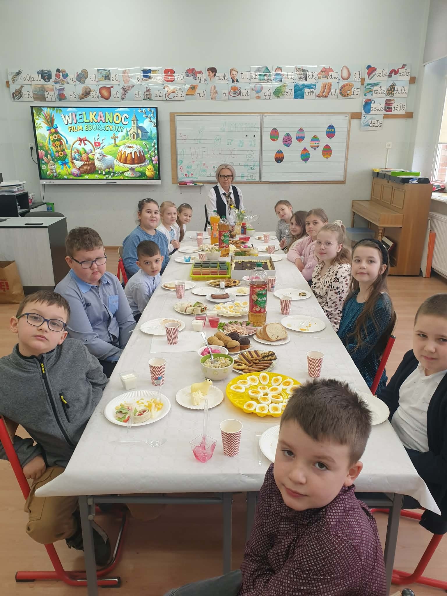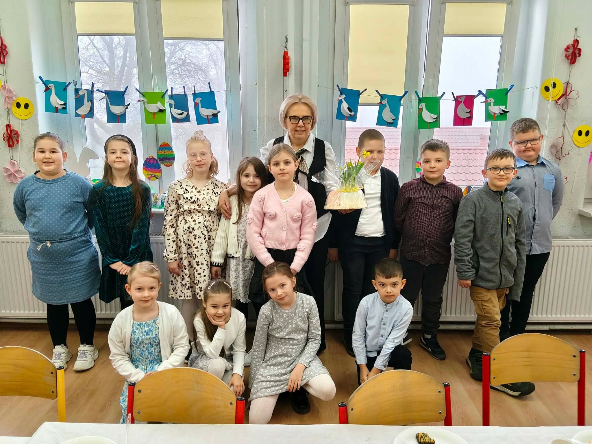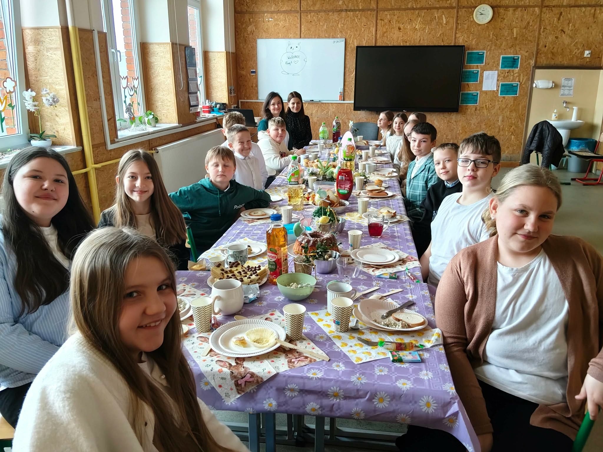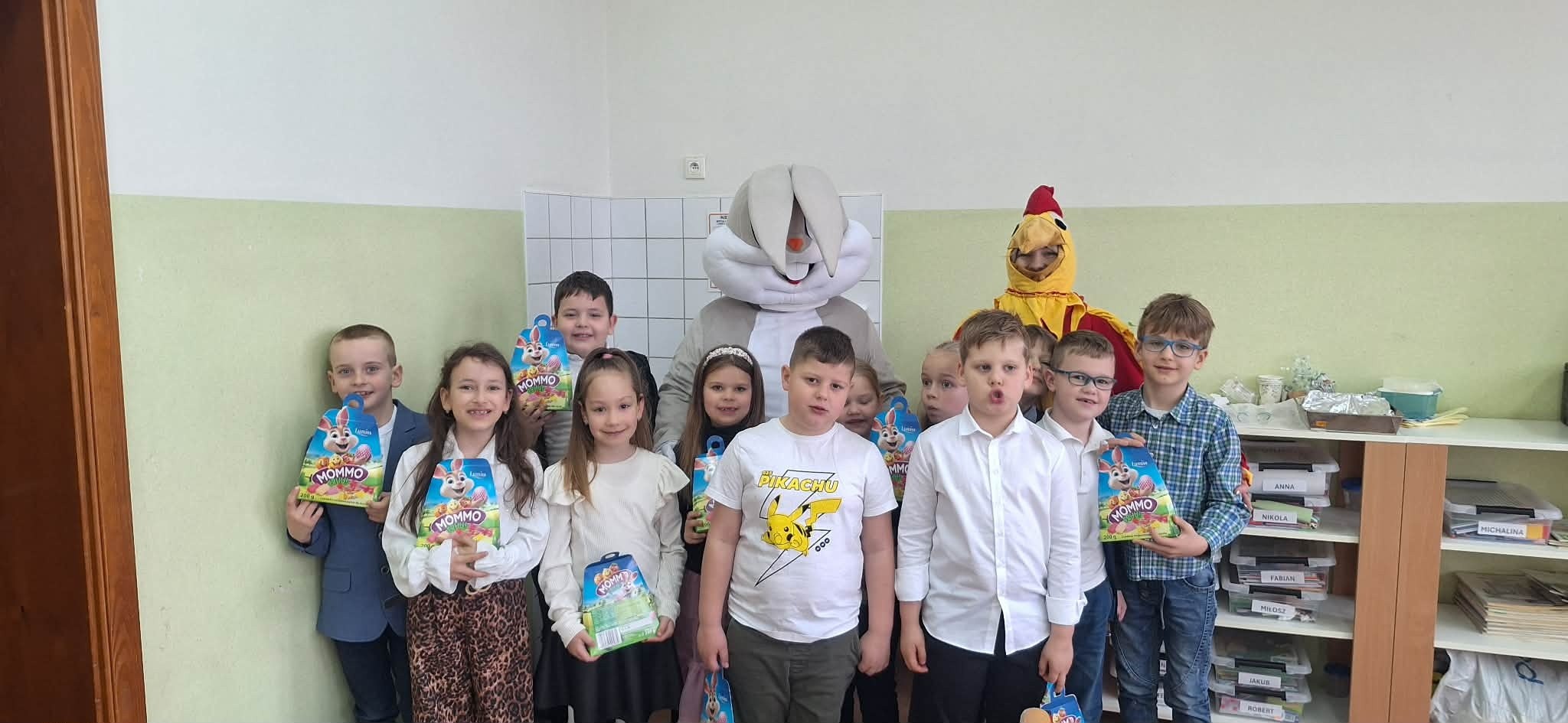Tradycyjnie już ostatniego dnia przed przerwą świąteczną społeczność naszej szkoły zasiadła do pięknie przystrojonych i bogatych w wielkanocne potrawy stołów. Uczniów odwiedzili Zajączek i Kurka, przynosząc życzenia i słodkie upominki. Nie zabrakło wspólnych zabaw, szukania jajek i gier terenowych. Dzień ten wprowadził nas w radosny, wiosenny klimat nadchodzących świąt.