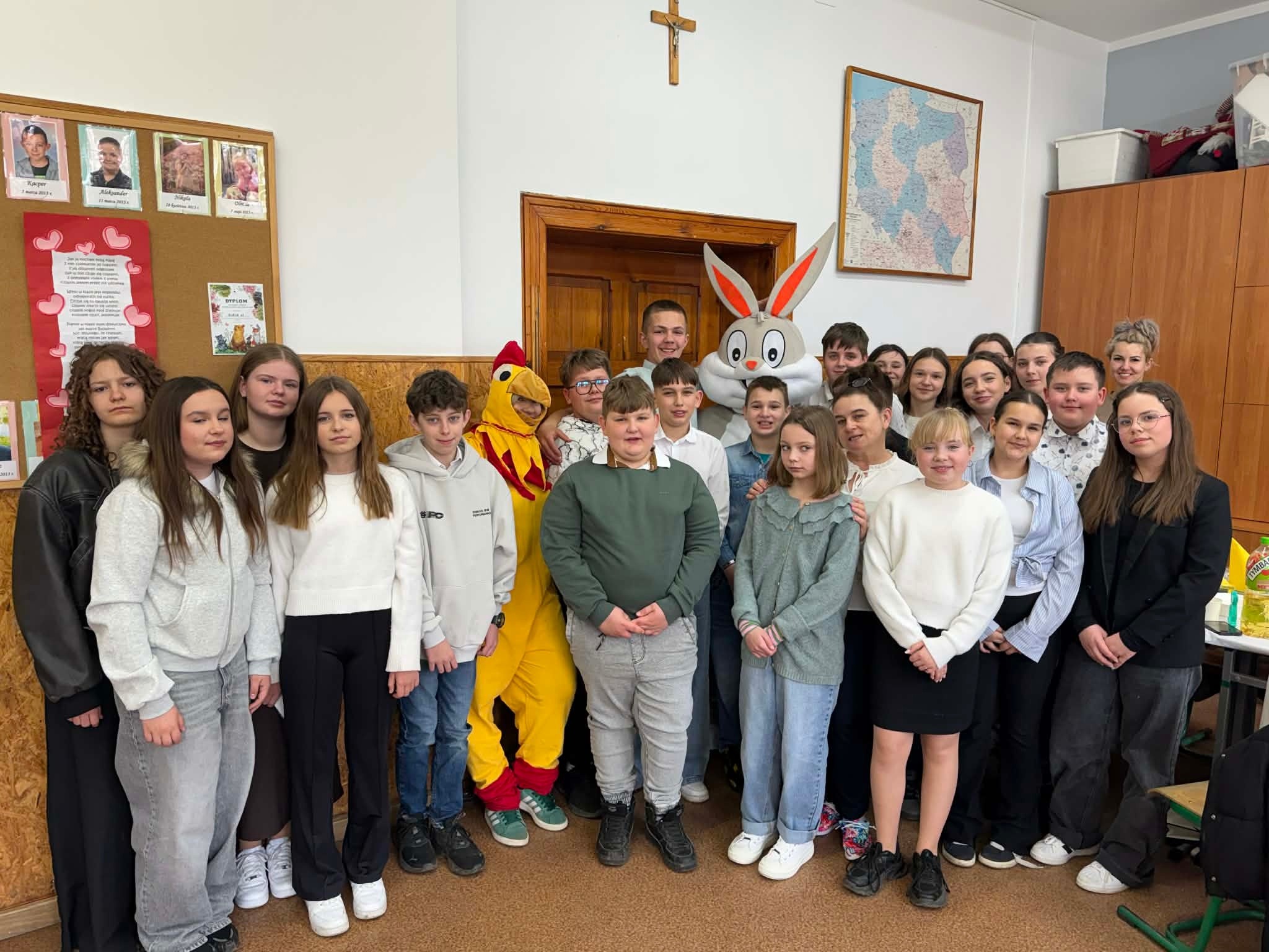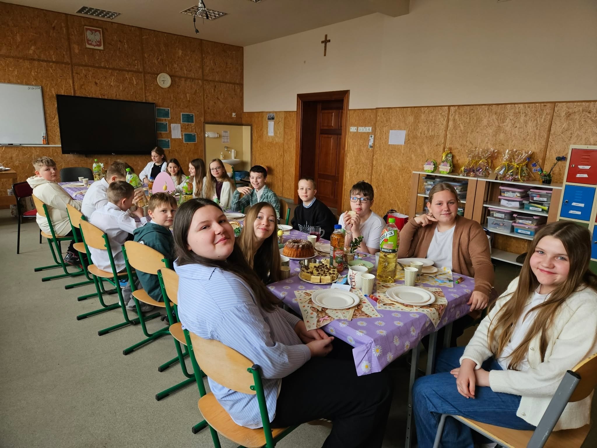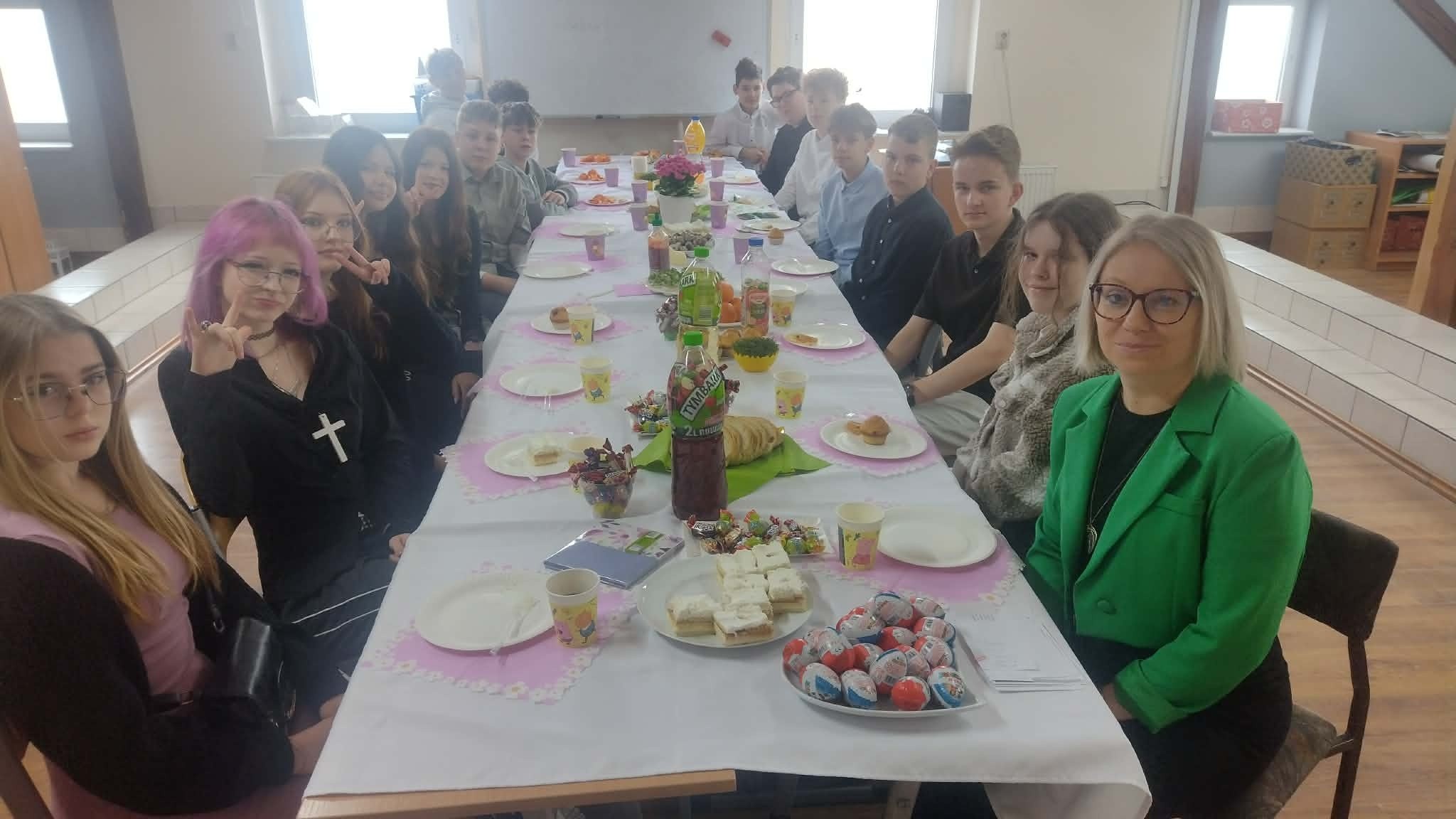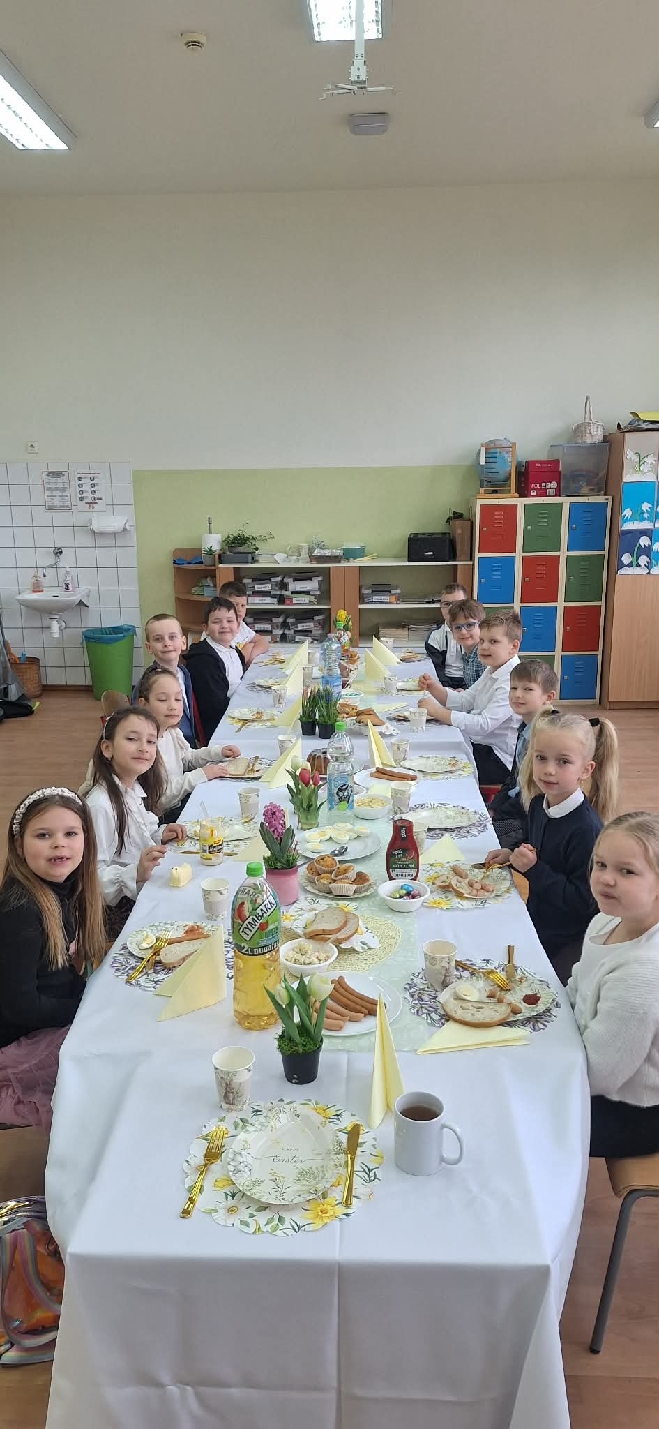 Tradycyjnie już ostatniego dnia przed przerwą świąteczną społeczność naszej szkoły zasiadła do pięknie przystrojonych i bogatych w wielkanocne potrawy stołów. Uczniów odwiedzili Zajączek i Kurka, przynosząc życzenia i słodkie upominki. Nie zabrakło wspólnych zabaw, szukania jajek i gier terenowych. Dzień ten wprowadził nas w radosny, wiosenny klimat nadchodzących świąt.