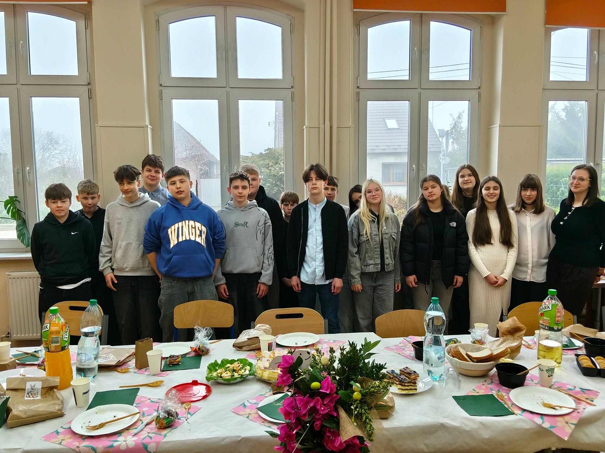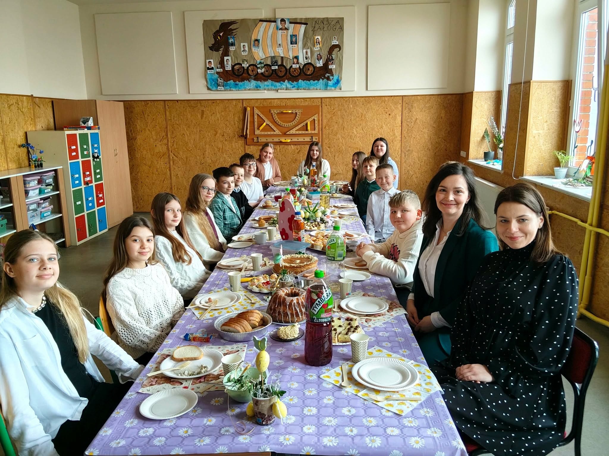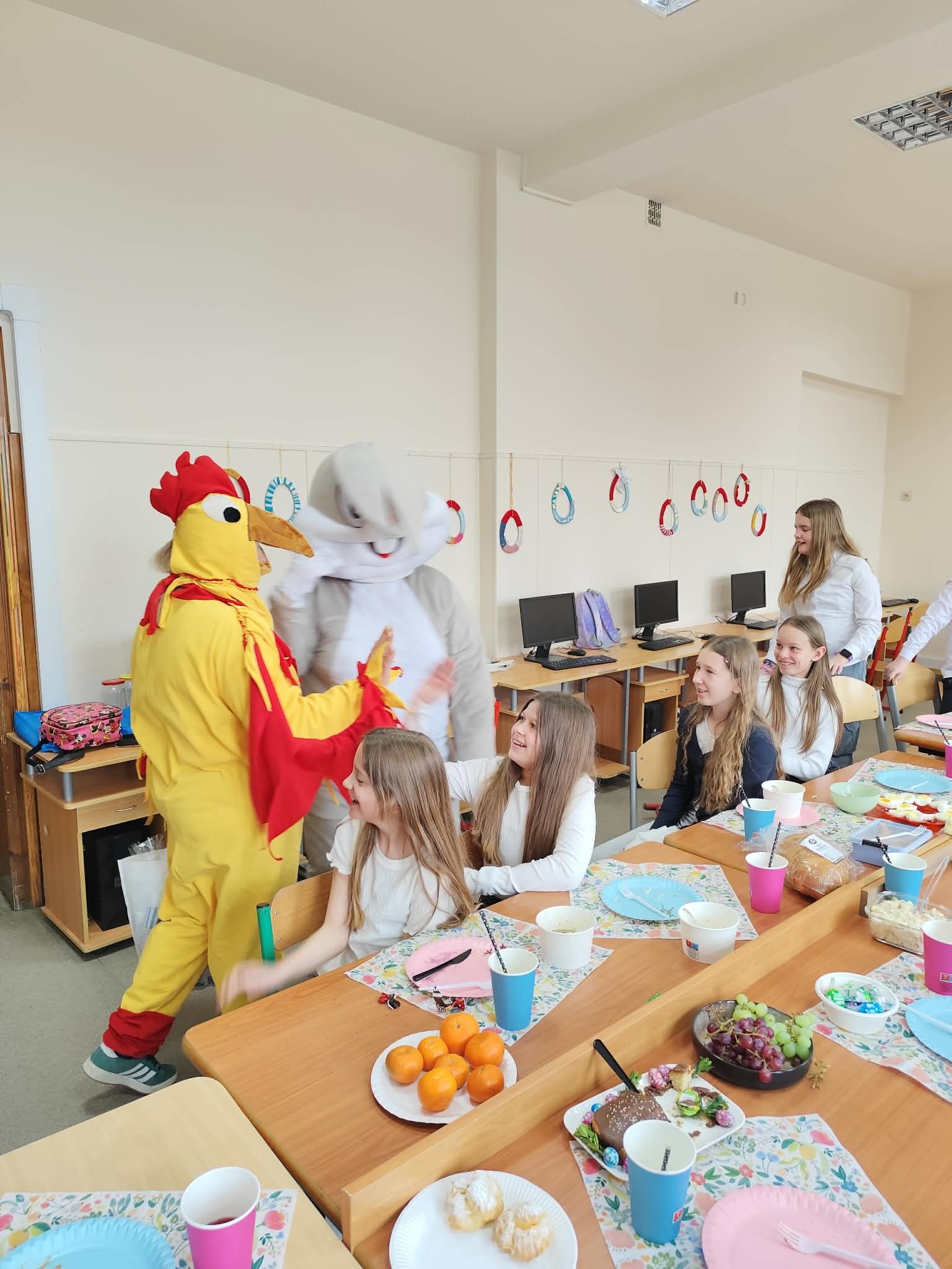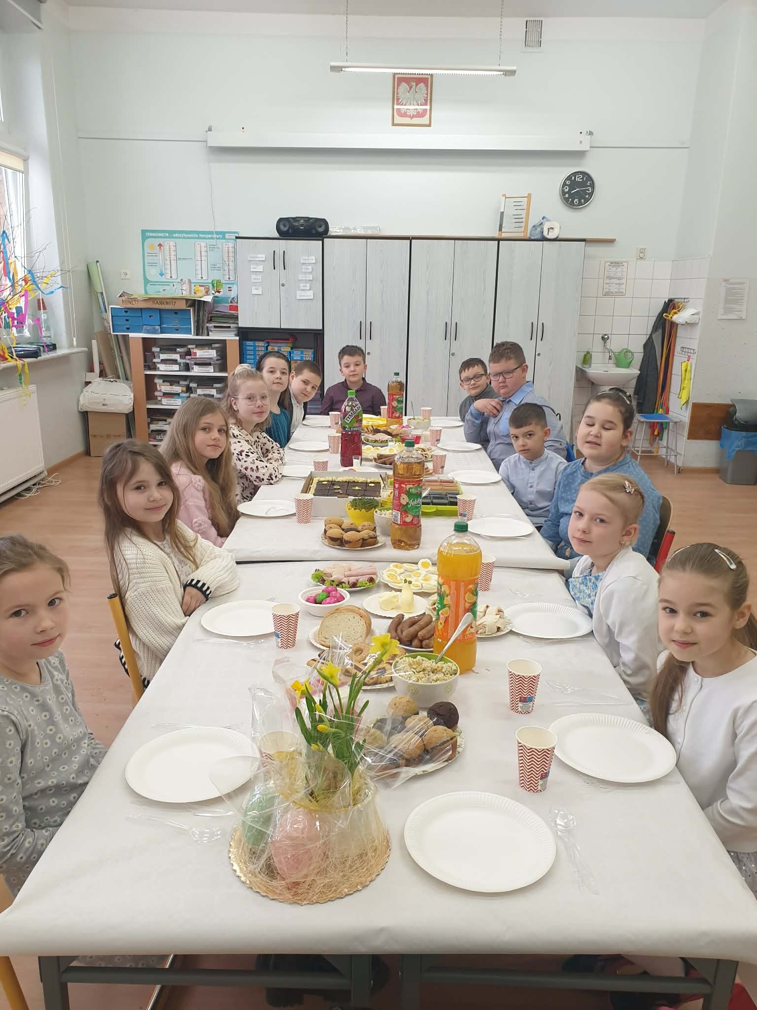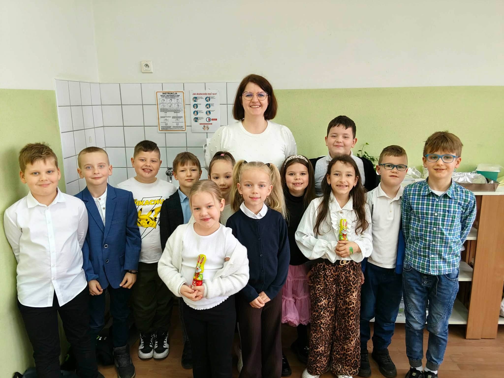 Tradycyjnie już ostatniego dnia przed przerwą świąteczną społeczność naszej szkoły zasiadła do pięknie przystrojonych i bogatych w wielkanocne potrawy stołów. Uczniów odwiedzili Zajączek i Kurka, przynosząc życzenia i słodkie upominki. Nie zabrakło wspólnych zabaw, szukania jajek i gier terenowych. Dzień ten wprowadził nas w radosny, wiosenny klimat nadchodzących świąt.