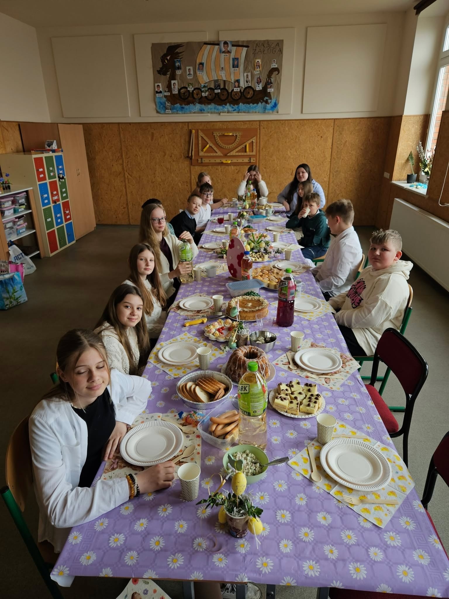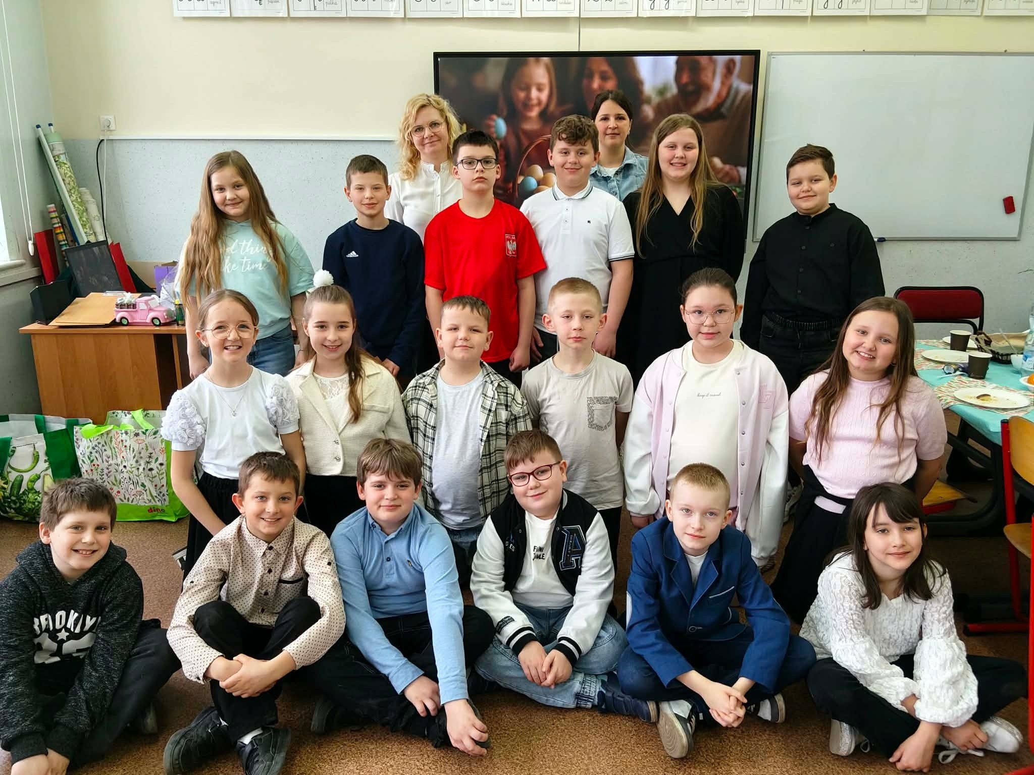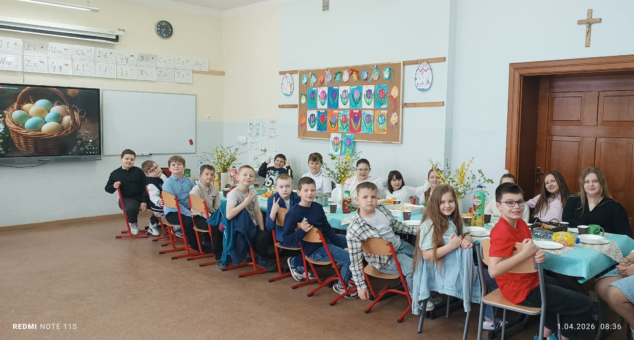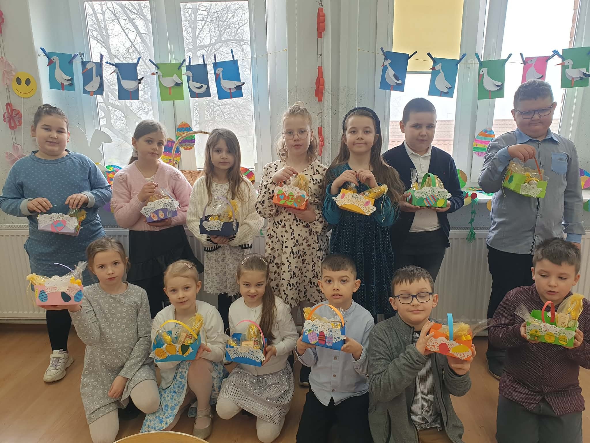 Tradycyjnie już ostatniego dnia przed przerwą świąteczną społeczność naszej szkoły zasiadła do pięknie przystrojonych i bogatych w wielkanocne potrawy stołów. Uczniów odwiedzili Zajączek i Kurka, przynosząc życzenia i słodkie upominki. Nie zabrakło wspólnych zabaw, szukania jajek i gier terenowych. Dzień ten wprowadził nas w radosny, wiosenny klimat nadchodzących świąt.