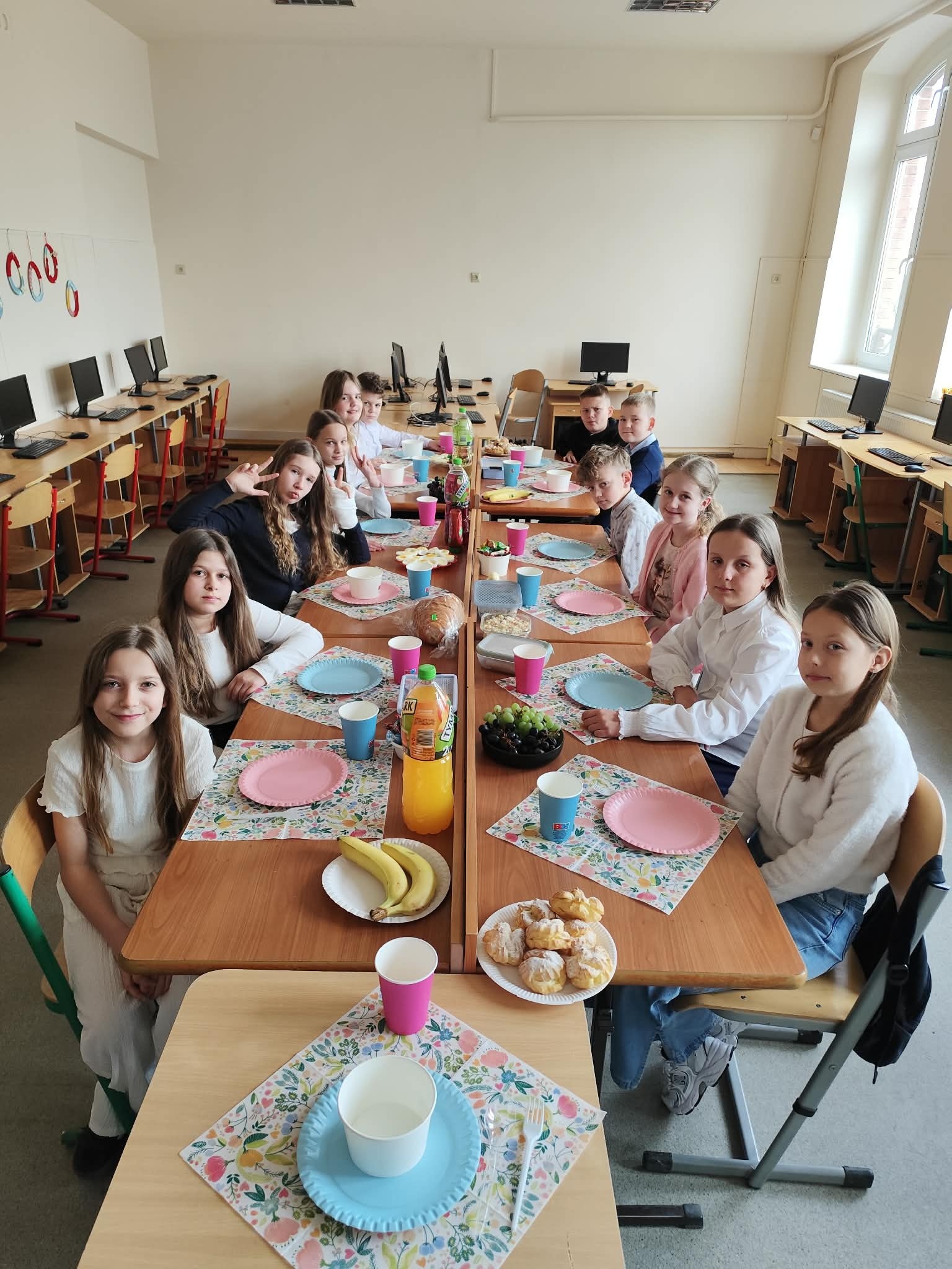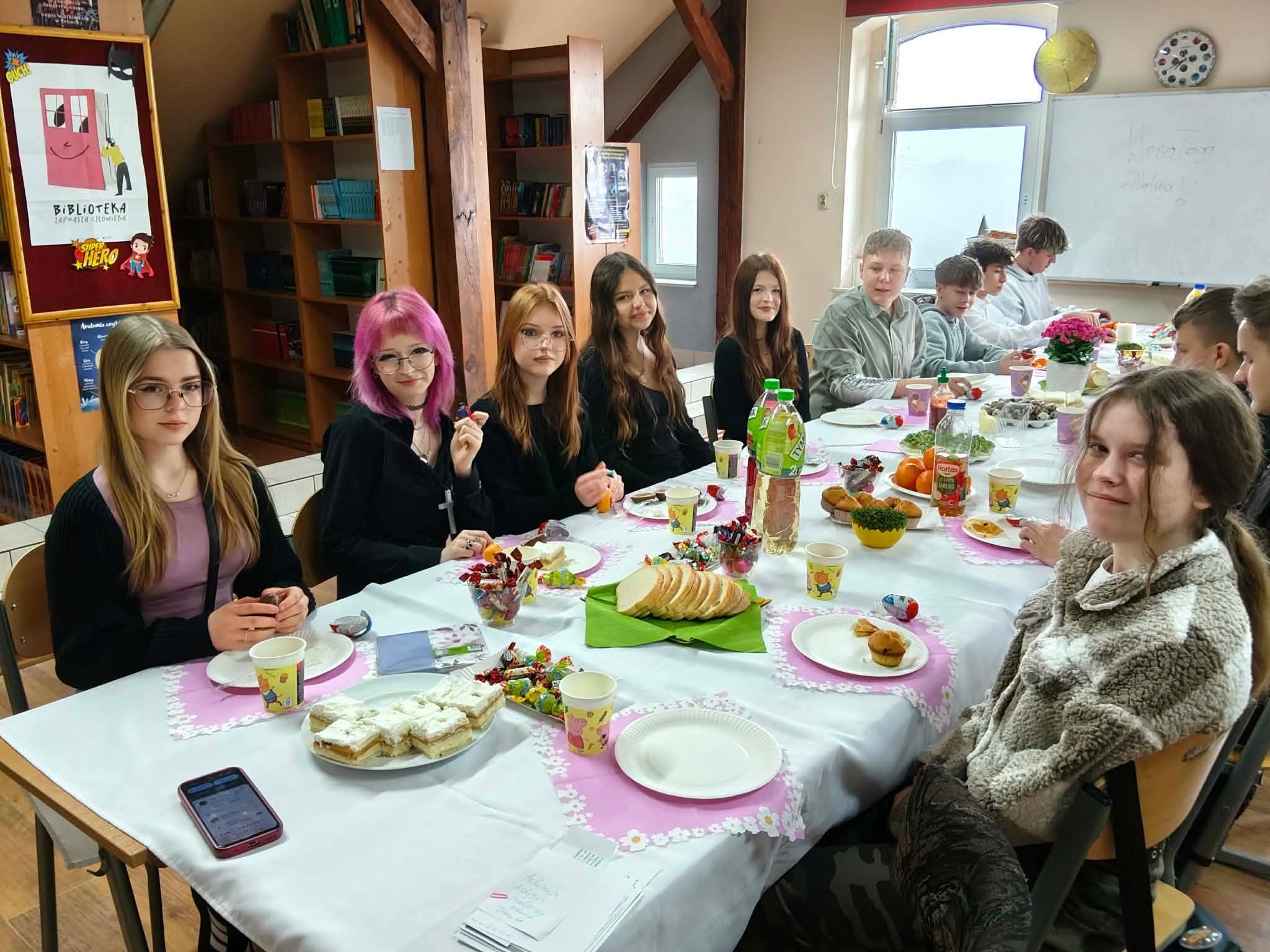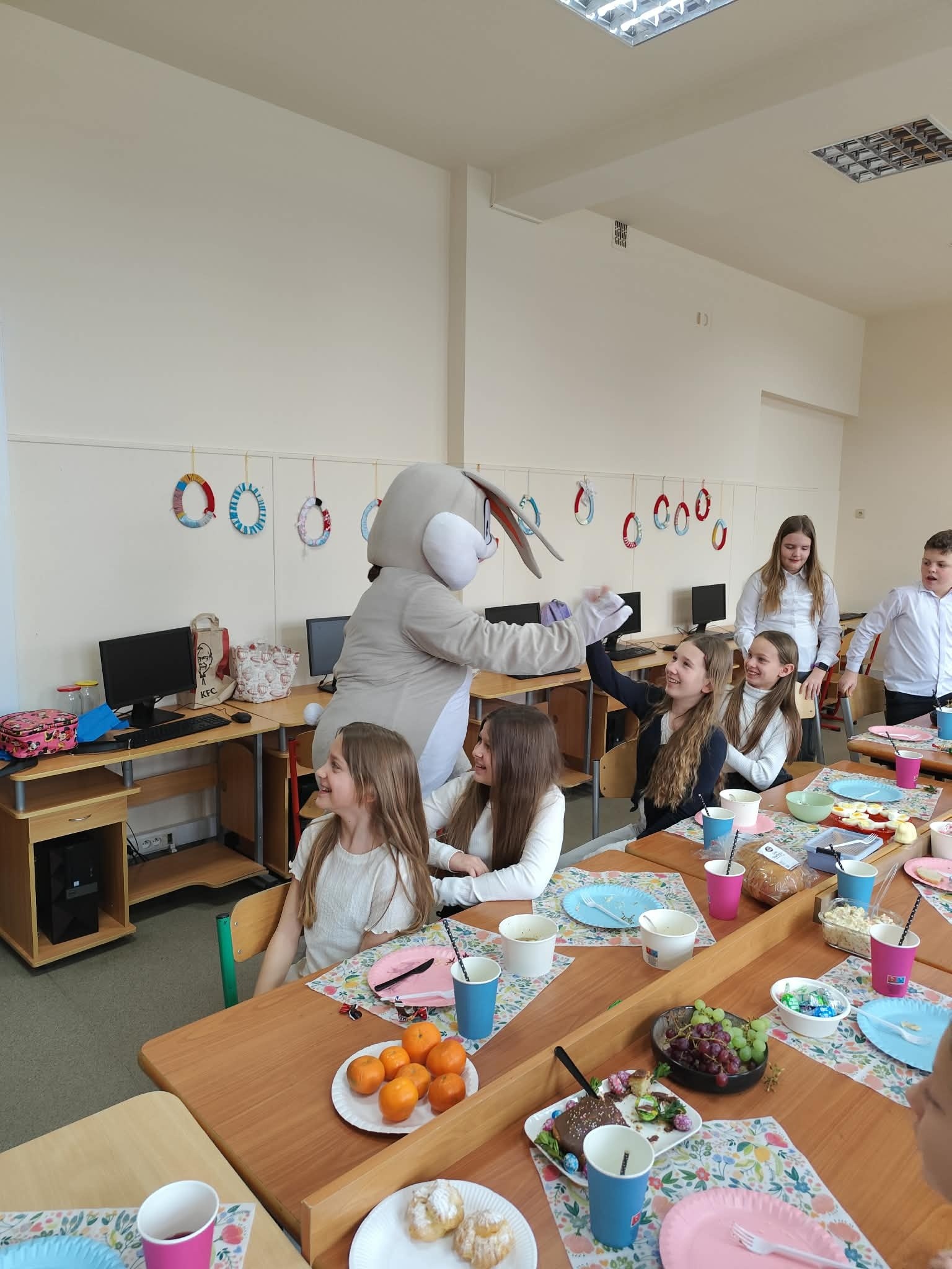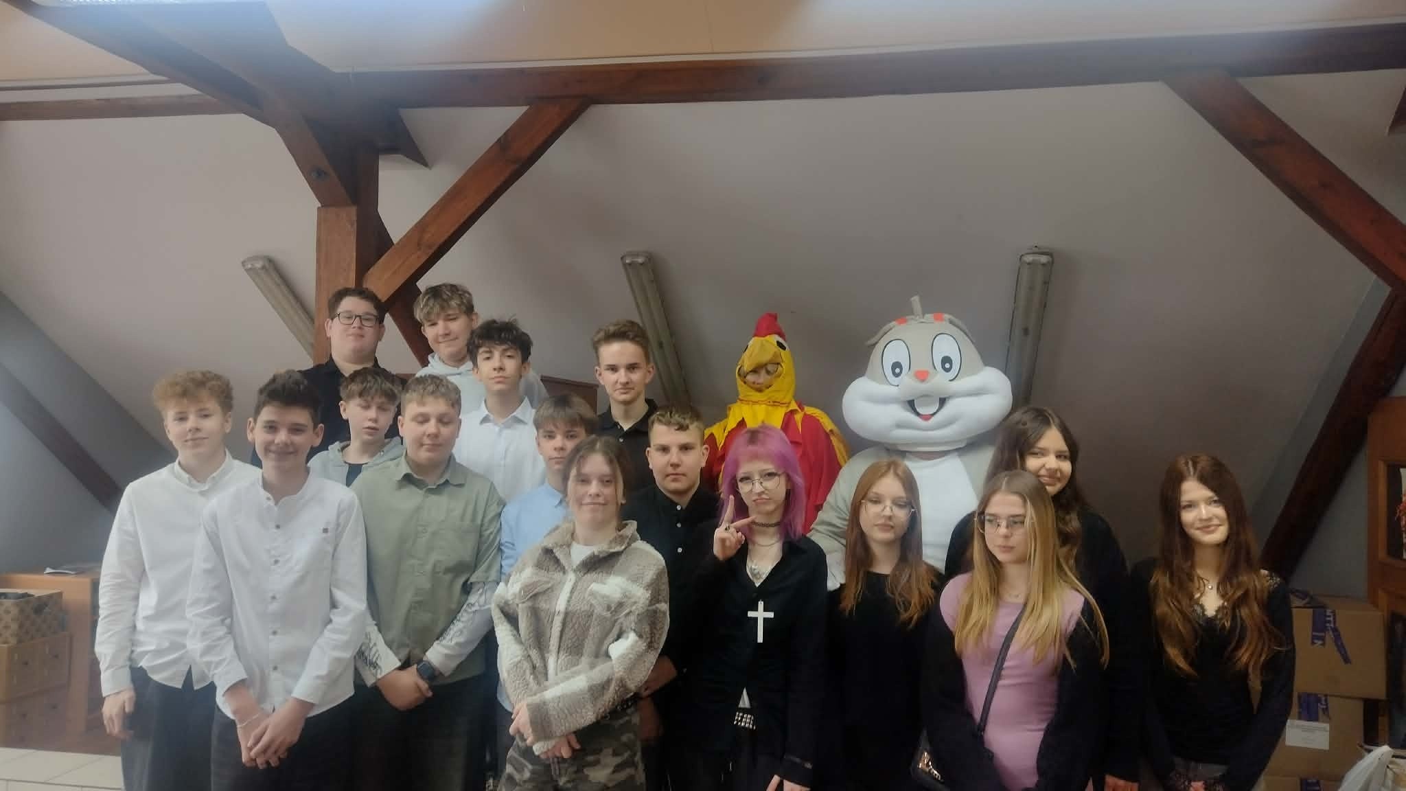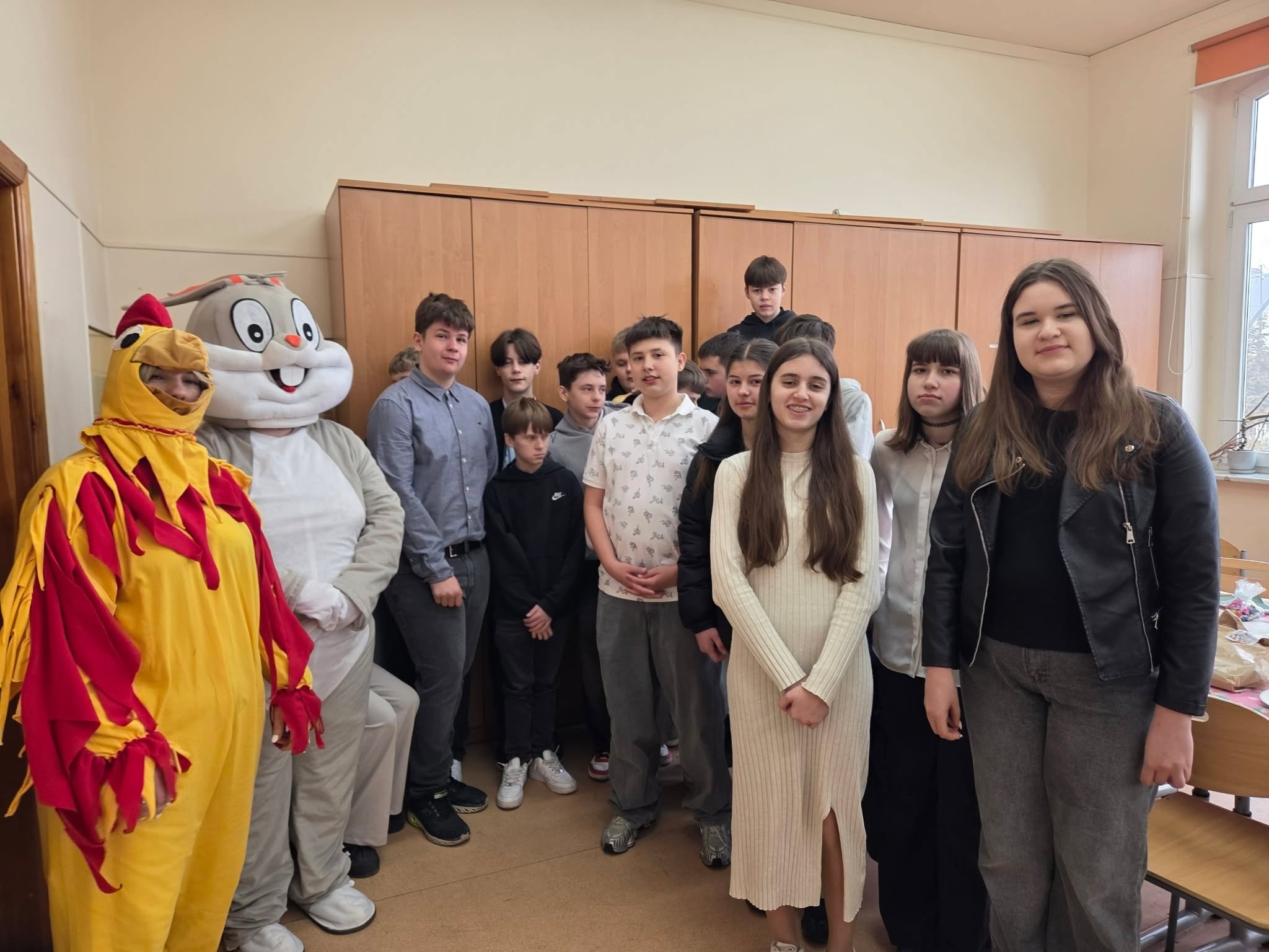 Tradycyjnie już ostatniego dnia przed przerwą świąteczną społeczność naszej szkoły zasiadła do pięknie przystrojonych i bogatych w wielkanocne potrawy stołów. Uczniów odwiedzili Zajączek i Kurka, przynosząc życzenia i słodkie upominki. Nie zabrakło wspólnych zabaw, szukania jajek i gier terenowych. Dzień ten wprowadził nas w radosny, wiosenny klimat nadchodzących świąt.